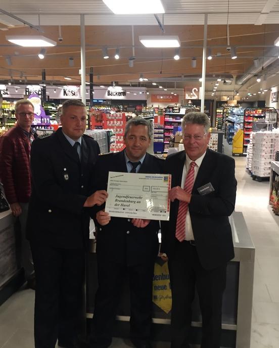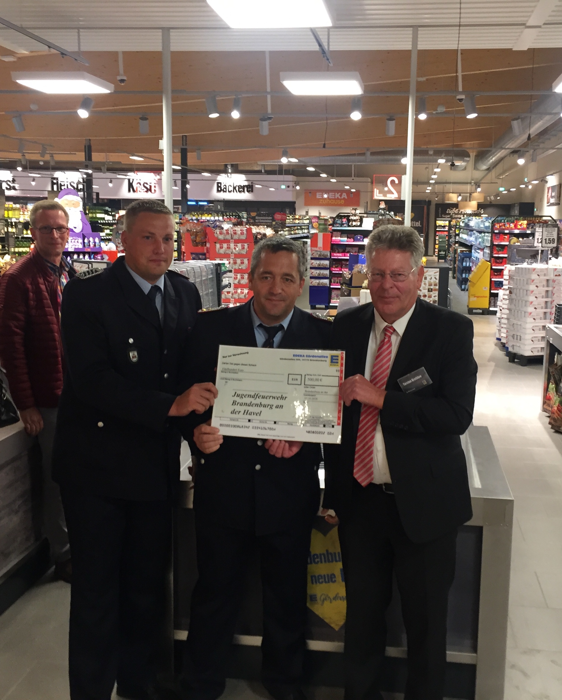 Edeka-Vertriebsleiter Torsten Krethlow unterstrich in seiner Begrüßungsrede das soziale Engagement von Edeka und überreichte dem SOS-Kinderdorf und der Brandenburger Jugendfeuerwehr einen Spendenscheck i.H.v. jeweils 500 EURO.