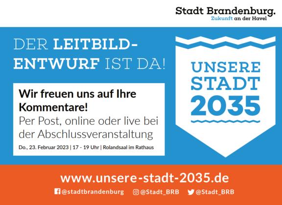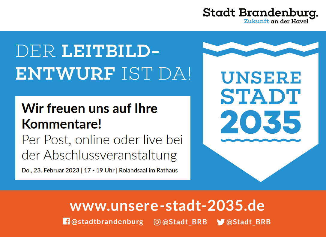 Eine weitere persönliche Gelegenheit zur Kommentierung besteht am Donnerstag, 23. Februar 2023, zwischen 17:00 und 19:00 Uhr im Rolandsaal des Altstädtischen Rathauses zur vierten Leitbildveranstaltung. Möglichkeiten zur Anmeldung werden rechtzeitig bekannt gegeben.