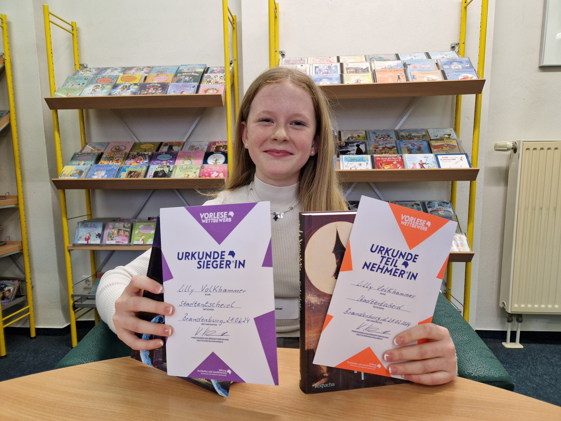 Eine knappe Stunde später und mit den Eindrücken von jeweils zwei gelesenen Texten zog sich die Jury zur Beratung zurück und kürte nach 20-minütiger Besprechung die drei besten Vorlesenden: Auf Platz 3 kam Matti Hildebrandt von der Evangelischen Grundschule, Platz 2 belegte Florentine Griesbach (von Saldern-Gymnasium) und zur Stadtsiegerin wurde Lilly Volkhammer aus der Schule am Krugpark ernannt. Sie bekam nebst dem Buchpreis („Das Geheimnis von Darkmoor Hall“ von Nina Scheweling) und der Urkunde für alle Teilnehmenden einen weiteren Buchpreis und die Siegerurkunde überreicht. Und sie wird die Stadt Brandenburg an der Havel beim Bezirksentscheid vertreten. Kann sie sich auch dort durchsetzen, stünde im Mai der Landesentscheid und vielleicht sogar der Bundesentscheid im Juni bevor.