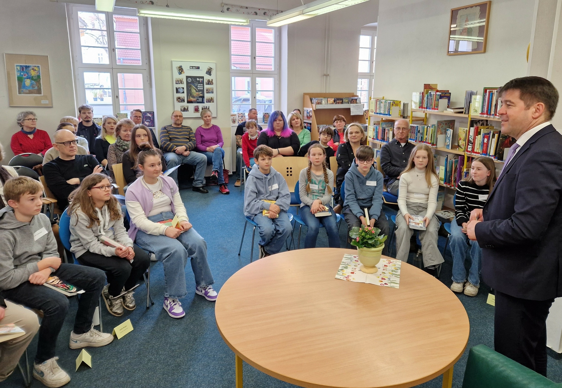 Der 65. Vorlesewettbewerb des deutschen Buchhandels ist in vollem Gange und ließ die Fouqué-Bibliothek bereits zum 32. Mal zur aufregenden Vorlese-Stube werden. Mittwoch trafen dort im Stadtentscheid zehn Schulsiegerinnen und -sieger aufeinander. In der Kinderbibliothek lasen sie vor Publikum und Juroren jeweils aus einem Lieblingsbuch und mussten sodann noch einen unbekannten Text vorlesen. Die Aufregung war groß, das Interesse auch und die Kinderbibliothek somit bestens gefüllt. Oberbürgermeister Steffen Scheller ist, sofern es sein Terminplan zulässt, jedes Jahr gern dabei und begrüßte die Lesenden samt Gästeschar herzlich.