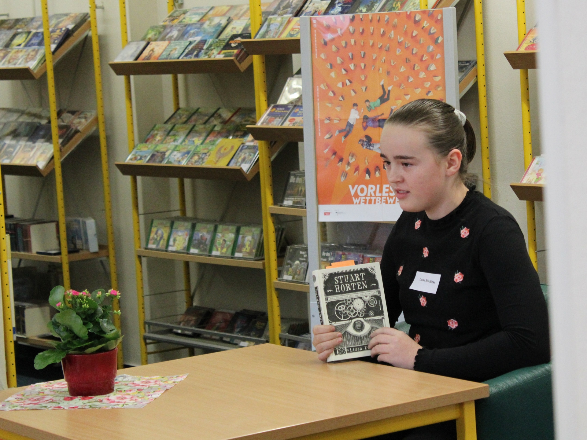 Die Schülerin der Frédéric-Joliot-Curie-Grundschule hatte sich für ihren Beitrag Lissa Evans Kinderbuch mit dem Titel „Stuart Horton – Acht Münzen und eine magische Werkstatt“ ausgesucht. Bildhaft und humorvoll wird dabei eine Geschichte voller räselhafter Hinweise erzählt, bis am Ende das Rätsel um eine magische Werkstatt gelüftet wird.