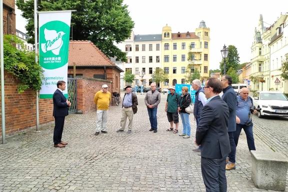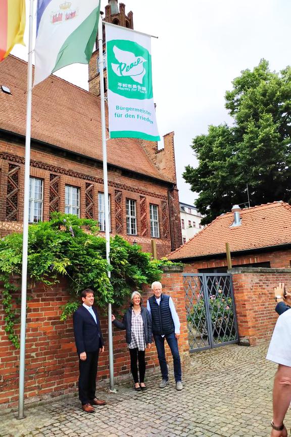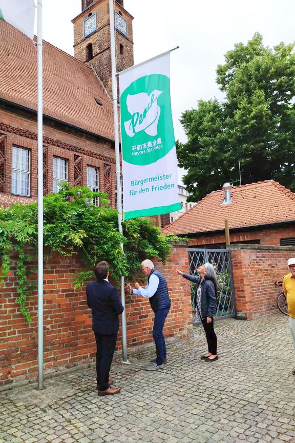 Gemeinsam mit Vertretern der SVV-Fraktionen wurde am heutigen Freitag, dem 8. Juli 2022, von Walter Paaschen, Vorsitzender der Stadtverordnetenversammlung, die Flagge des weltweiten Bündnisses „Mayors for Peace – Bürgermeister für Frieden“ vor dem Altstädtischen Rathaus in Brandenburg an der Havel gehisst.