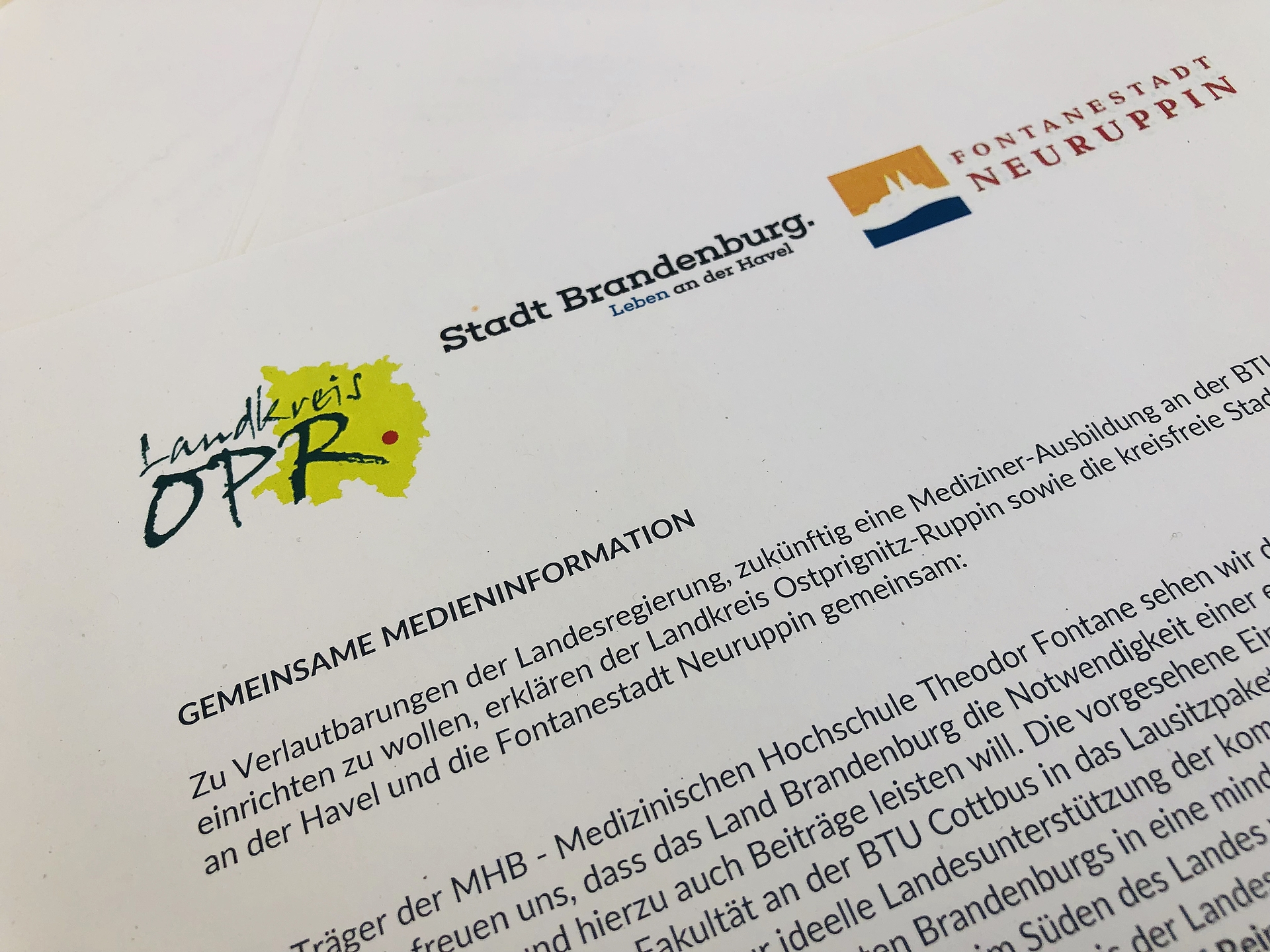 Zu Verlautbarungen der Landesregierung, zukünftig eine Mediziner-Ausbildung an der BTU – Cottbus einrichten zu wollen, erklären der Landkreis Ostprignitz-Ruppin sowie die kreisfreie Stadt Brandenburg an der Havel und die Fontanestadt Neuruppin gemeinsam: