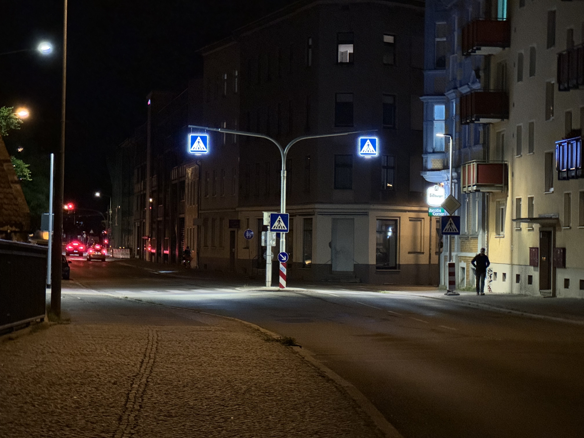 Ausgestattet mit warmweißem LED-Licht, leuchten sie nicht nur die Querungsbereiche, sondern auch die Aufstellflächen davor und dahinter aus. Damit werden Fußgänger für Autofahrer deutlich früher sichtbar.