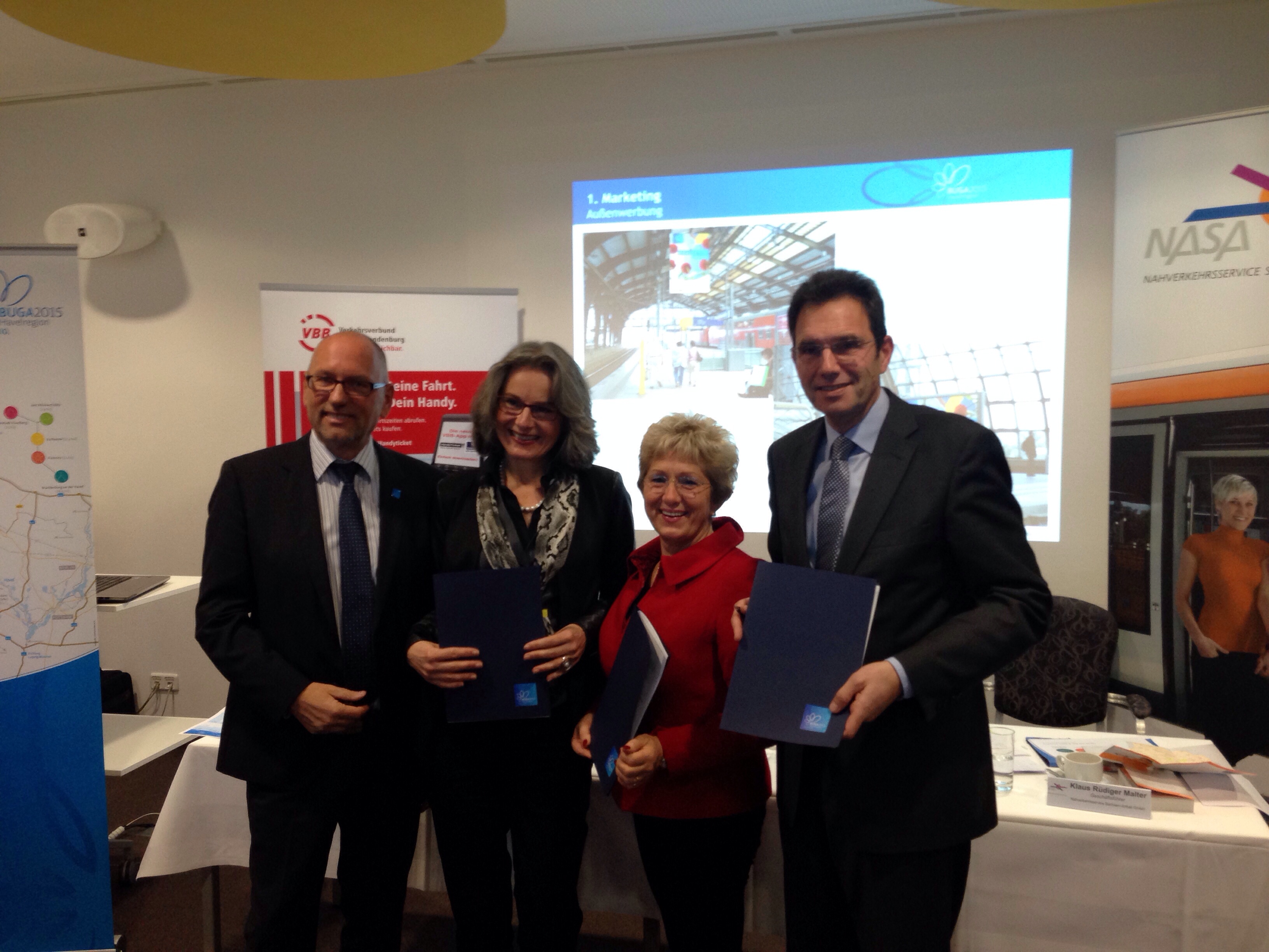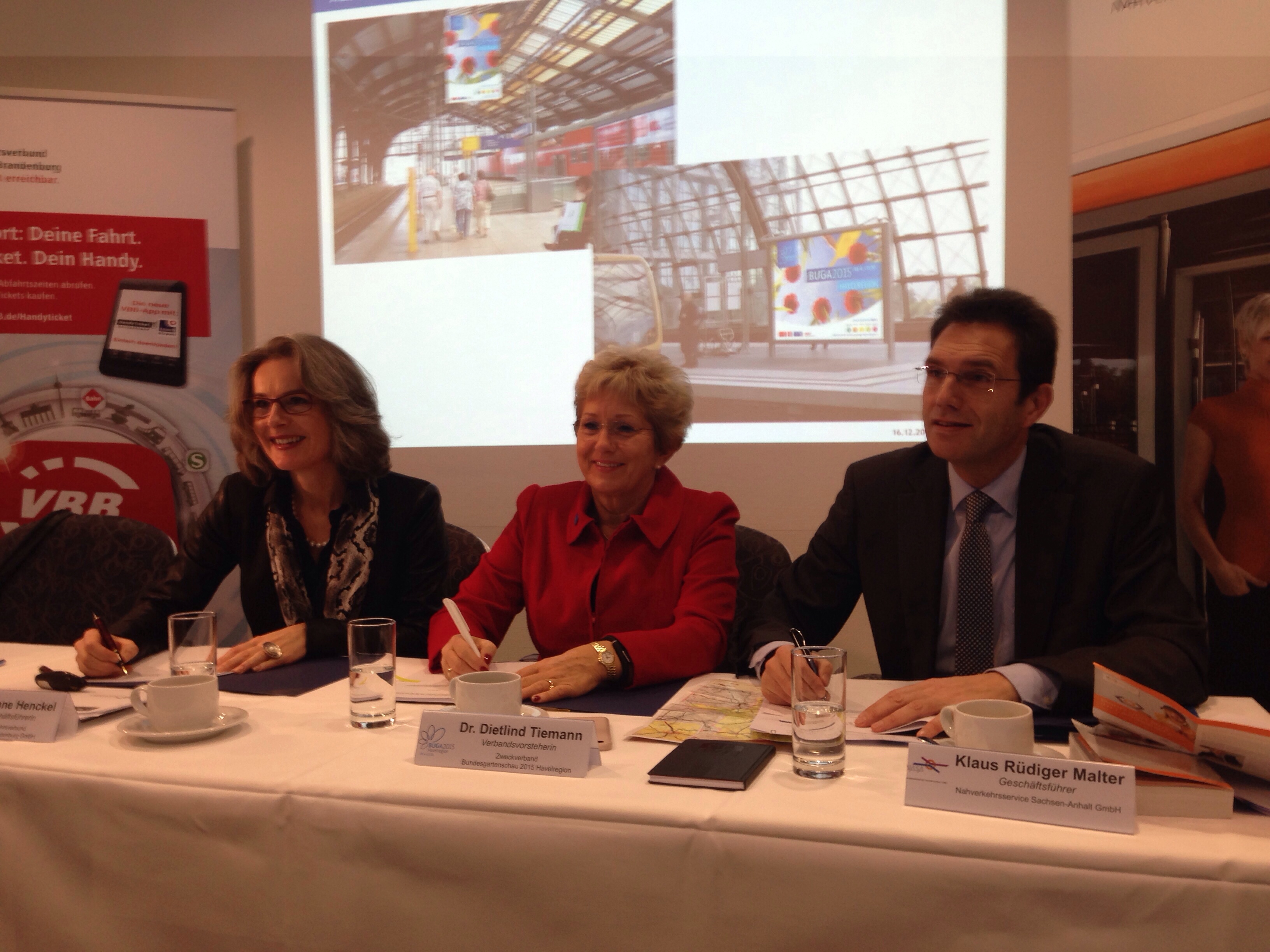 Am Dienstag, 16.12.2014, stellten Zweckverbandsvorsitzende und Oberbürgermeisterin Dr. Dietlind Tiemann, BUGA-Geschäftsführer Erhard Skupch und die Geschäftsführer der Verkehrsverbund Berlin-Brandenburg GmbH (VBB), Susanne Henckel sowie von der Nahverkehrsservice Sachsen-Anhalt GmbH (NASA) Klaus Rüdiger Malter die Möglichkeiten der Anreise zur Bundesgartenschau mit öffentlichen Verkehrsmitteln vor.
