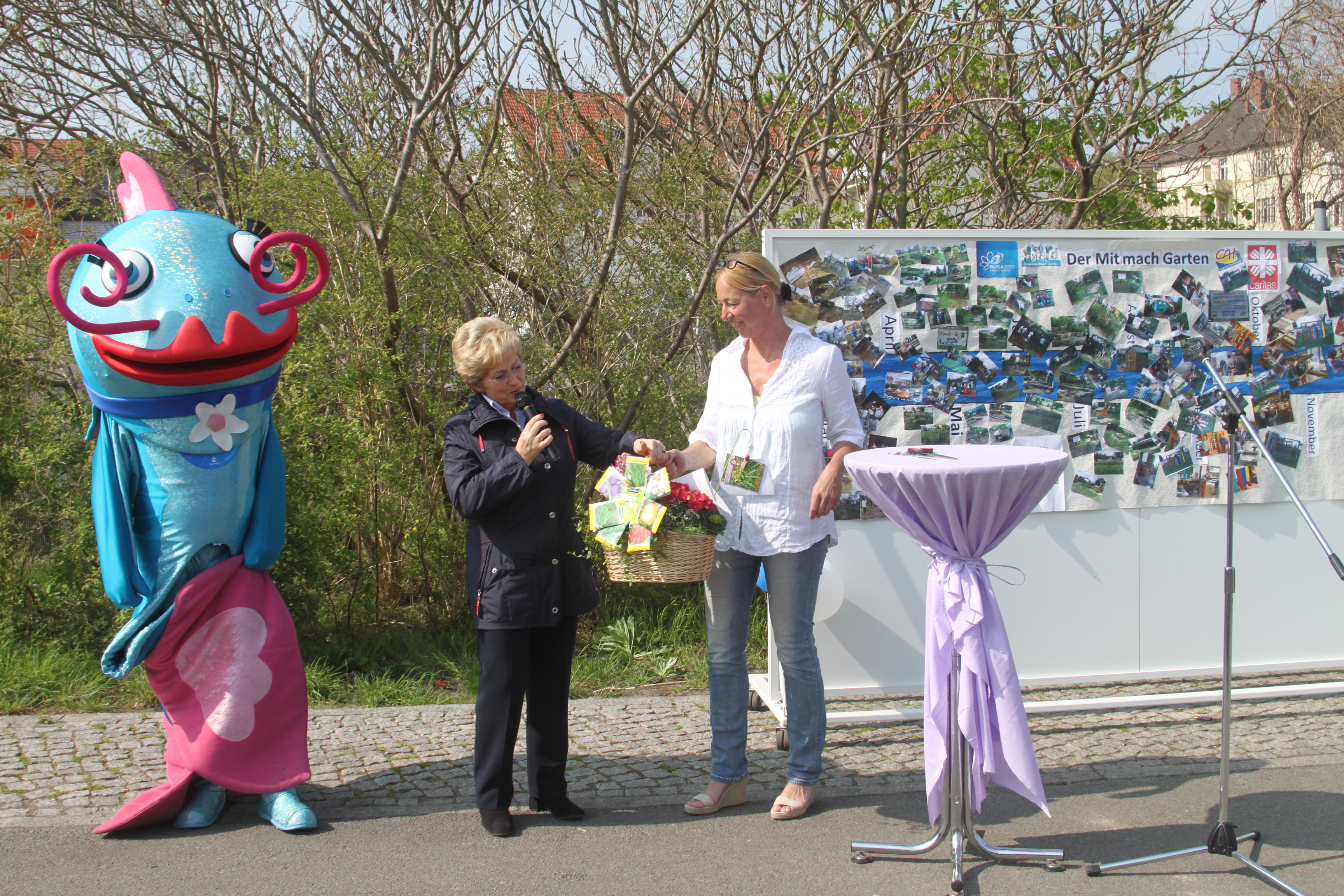 Am Freitag, 24.04.2015, öffnete der Ökogarten am Club am Trauerberg (CaT) seine Pforten. Oberbürgermeisterin Dr. Dietlind Tiemann überreichte einen kleinen Blumenkorb an die CaT-Leiterin Cécile Templin und gratulierte zum gelungenen Projekt.