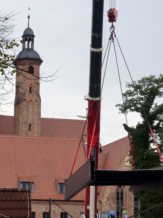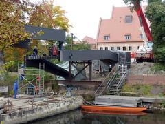 Wichtiger Schritt beim Neubau der Fuß- und Radwegbrücke über den Stadtkanal erfolgreich abgeschlossen. Fertigstellung und Übergabe der Brücke soll noch vor Weihnachten erfolgen.