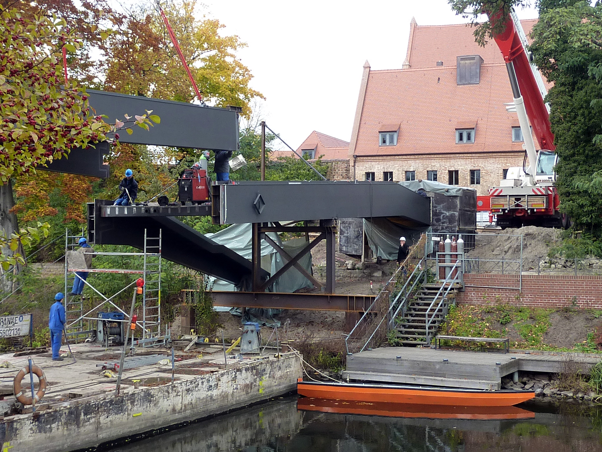 Seit dem Anfang Juni 2010 in Brandenburg an der Havel der Grundstein für den Neubau einer Fuß- und Radwegbrücke über den Stadtkanal gelegt wurde, sind die Bauarbeiten an dieser wichtigen Verbindung zwischen Hauptbahnhof und Innenstadt bereits weit voran geschritten. Sichtbares Zeichen dafür ist die Montage des mächtigen Mittelteils der Stahlkonstruktion, die am 27.10.2010 erfolgte.