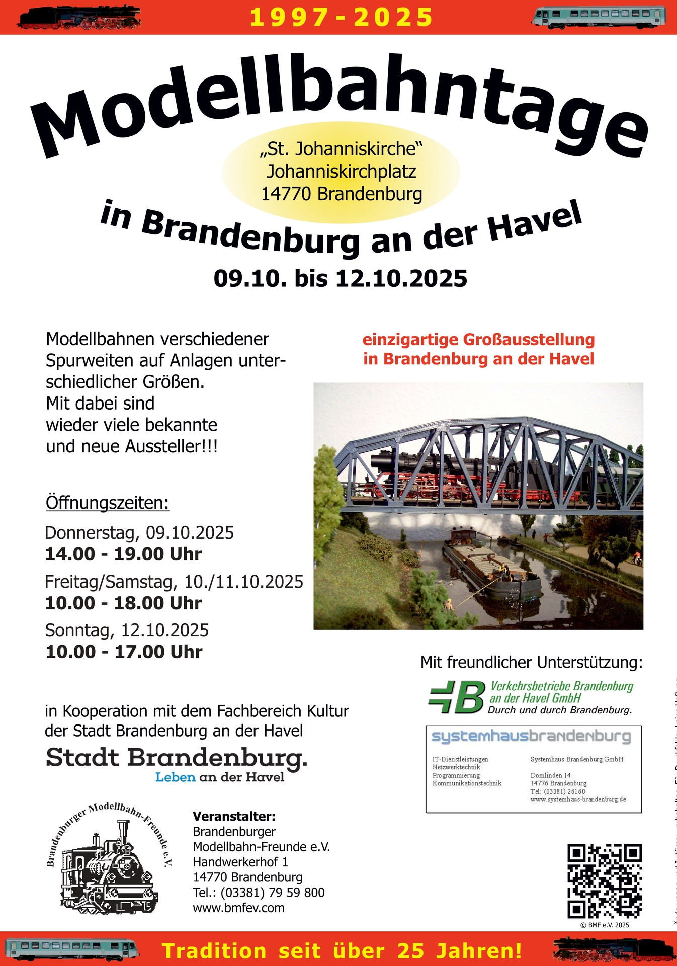 Ab Donnerstag, den 9. Oktober, bis einschließlich 12. Oktober lädt der Brandenburger Modellbau-Freunde e. V. zu den „Modellbahntagen 2025“ ein. Dafür werden – in Kooperation mit den Brandenburger Verkehrsbetrieben und dem Kulturbüro der Stadt Brandenburg an der Havel – Modellbahnen verschiedenster Größen und auf unterschiedlichsten Anlagen ausgestellt. Auch dieses Jahr werden in der St. Johanniskirche am Johanniskirchplatz bekannte Aussteller aufbauen, aber auch ganz neue werden zu sehen sein.