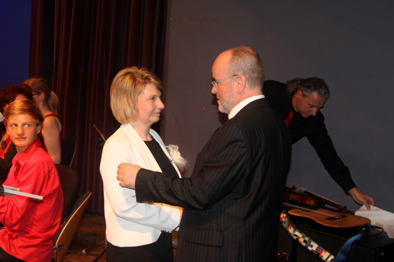 Zum Beginn des Festaktes richteten Bürgermeister Steffen Scheller und Stefan Dalitz, Vorsitzender des Förderkreises, Grußworte an die Gäste. Musikschuldirektor Bernd Heese bedankte sich bei allen Kolleginnen und Kollegen, Mitstreitern und Musikschülern für die gute Zusammenarbeit und übergab den „Staffelstab“ an die Musikschullehrerin Angelika Eckelmann, die ab 01.05.2013 als neue Musikschuldirektorin die Musikschule „Vicco von Bülow“ leiten wird. Bernd Heese scheidet mit Ablauf des Monats aus dem Verwaltungsdienst aus.