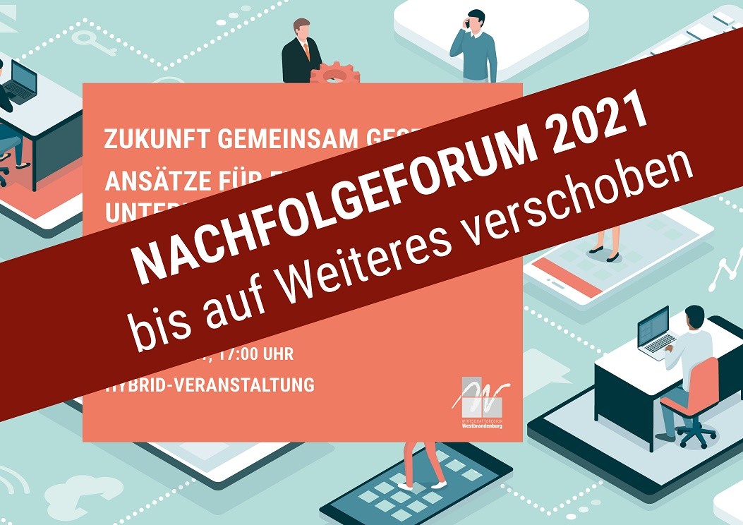 Aufgrund der aktuellen Situation hat sich der Arbeitskreis Nachfolge des Netzwerkes Unternehmenskultur entschlossen, das für den 02.06.2021 geplante Nachfolgeforum bis auf Weiteres zu verschieben. Die aktuelle Eindämmungsverordnung lässt eine zielgerichtete Durchführung der Veranstaltung am 02.06.2021 nicht zu. Wir sind jedoch optimistisch, dass sich die Situation insgesamt bessern wird und haben daher bereits mit den ersten Planungen zum neuen Veranstaltungstag begonnen. Zu gegebener Zeit werden wir alle angemeldeten TeilnehmerInnen und Interessierten ebenso wie die Presse über den neuen Veranstaltungstag sowie alle dann geltenden Bedingungen informieren.
