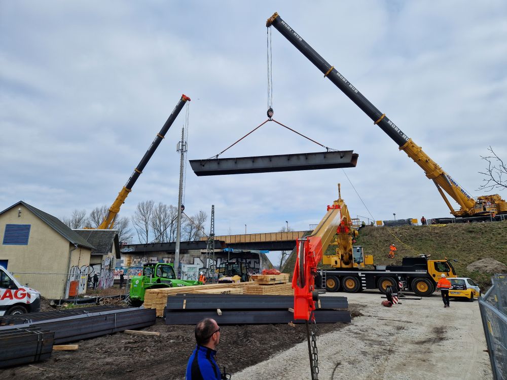 „In den kommenden Monaten werden auf der Baustelle die Unterwasserbetonsohlen zur Abdichtung gegen das Grundwasser, die Fundamente und die Widerlager hergestellt. Während der Bahn-Sperrpause vom 17.01.25 bis 20.01.25 soll der neue Überbau eingehoben werden.“