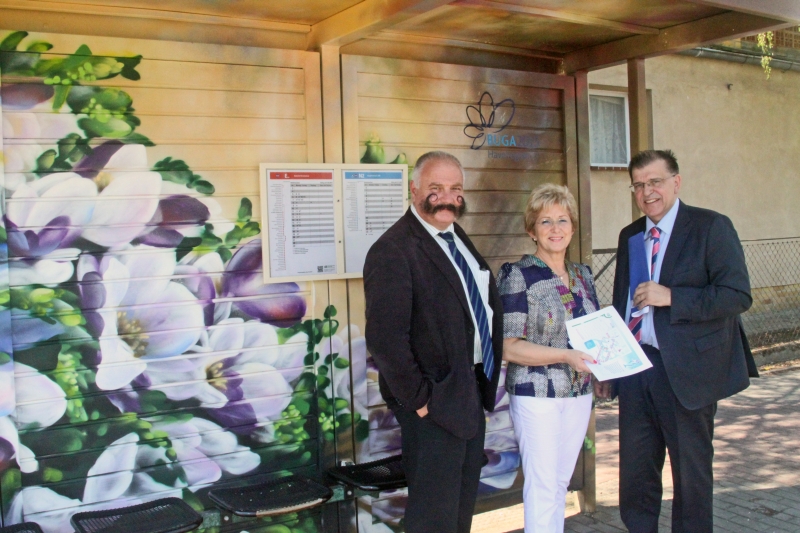 Am Donnerstag, 22.05.2014, präsentierten in Vorbereitung zur BUGA 2015 Havelregion Oberbürgerbürgermeisterin Dr. Dietlind Tiemann und Werner Jumpertz, Geschäftsführer der Verkehrsbetriebe Brandenburg an der Havel GmbH (VBBr), die von Guido Raddatz, Agentur colorful, im BUGA-Design gestaltete Bushaltestelle am Einkaufszentrum Veilchenweg.