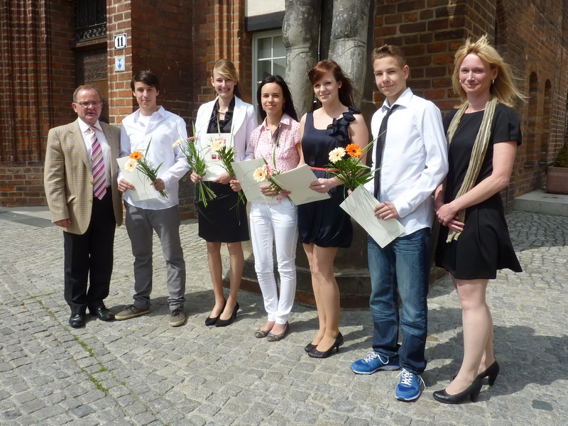 Am Mittwoch, 13.06.2012, haben Hans-Jürgen Arndt, 2. Stellverter der Vorsitzenden der Stadtverordnetenversammlung, Detlef Reckow, Fachbereichsleiter Verwaltungs- und Finanzmanagement, und Gabriele Dettmann, Vorsitzende des Personalrates, im feierlichen Rahmen fünf neue Auszubildende in der Brandenburger Stadtverwaltung begrüßt und ihnen die Ausbildungsverträge überreicht.