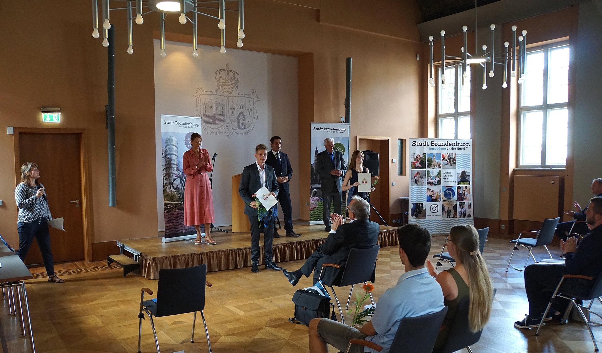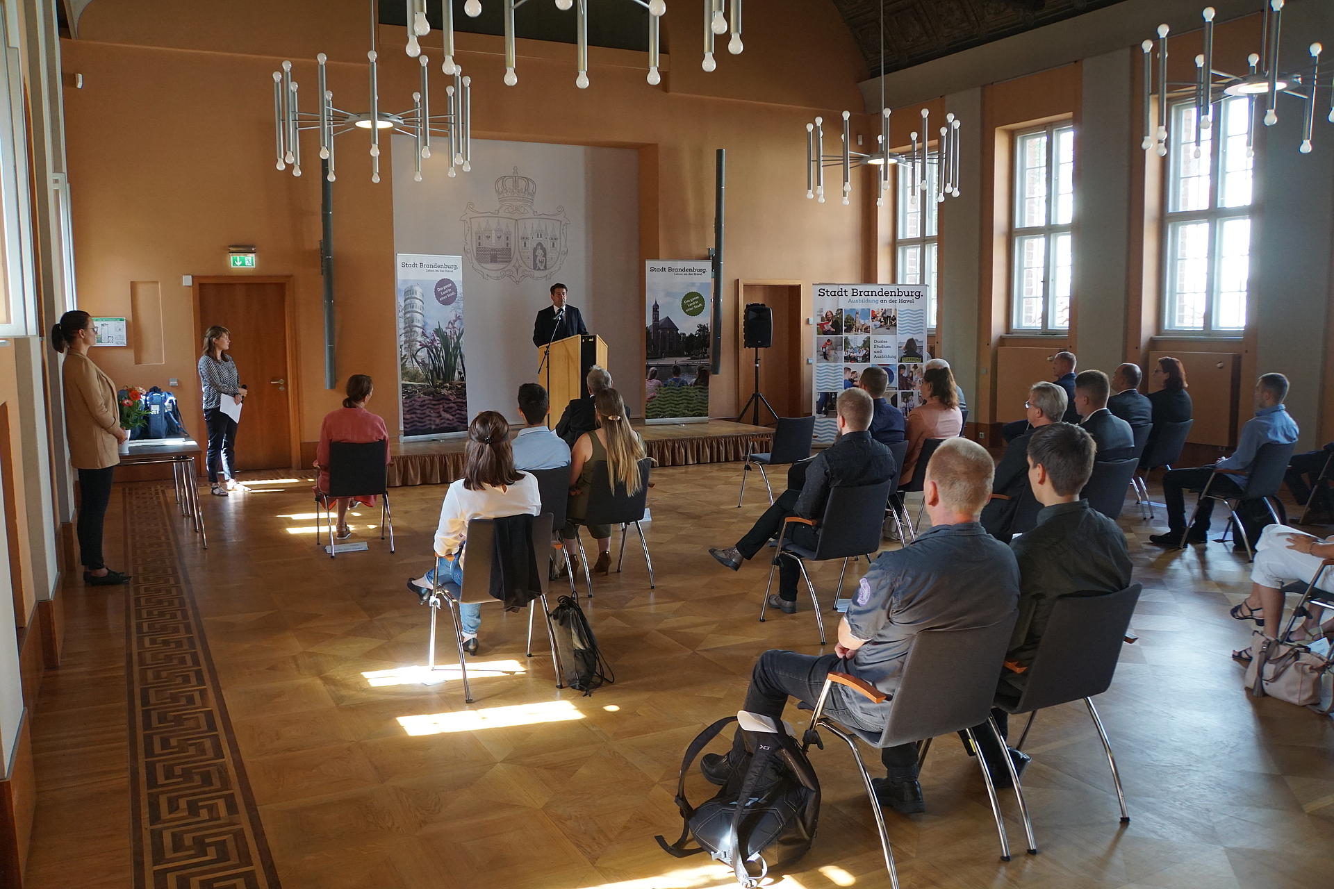 Im Rolandsaal des Altstädtischen Rathauses ließen es sich der Vorsitzende der Stadtverordnetenversammlung Herr Walter Paaschen, der Oberbürgermeister Herr Steffen Scheller, der Fachgruppenleiter der Personalverwaltung Herr Marc Blumeyer, die Ausbildungsleiterin Frau Claudia Vogel, der Leiter der Brandenburgischen Kommunalakademie Herr Thomas Miltkau sowie die Personalratsvorsitzende Frau Claudia Sellin-Stieger nicht nehmen, die Auszubildenden und Studierenden persönlich zu begrüßen. Darüber hinaus werden am 07.08.2020 drei Brandmeisteranwärter ernannt und absolvieren eine Ausbildung in der Berufsfeuerwehr.