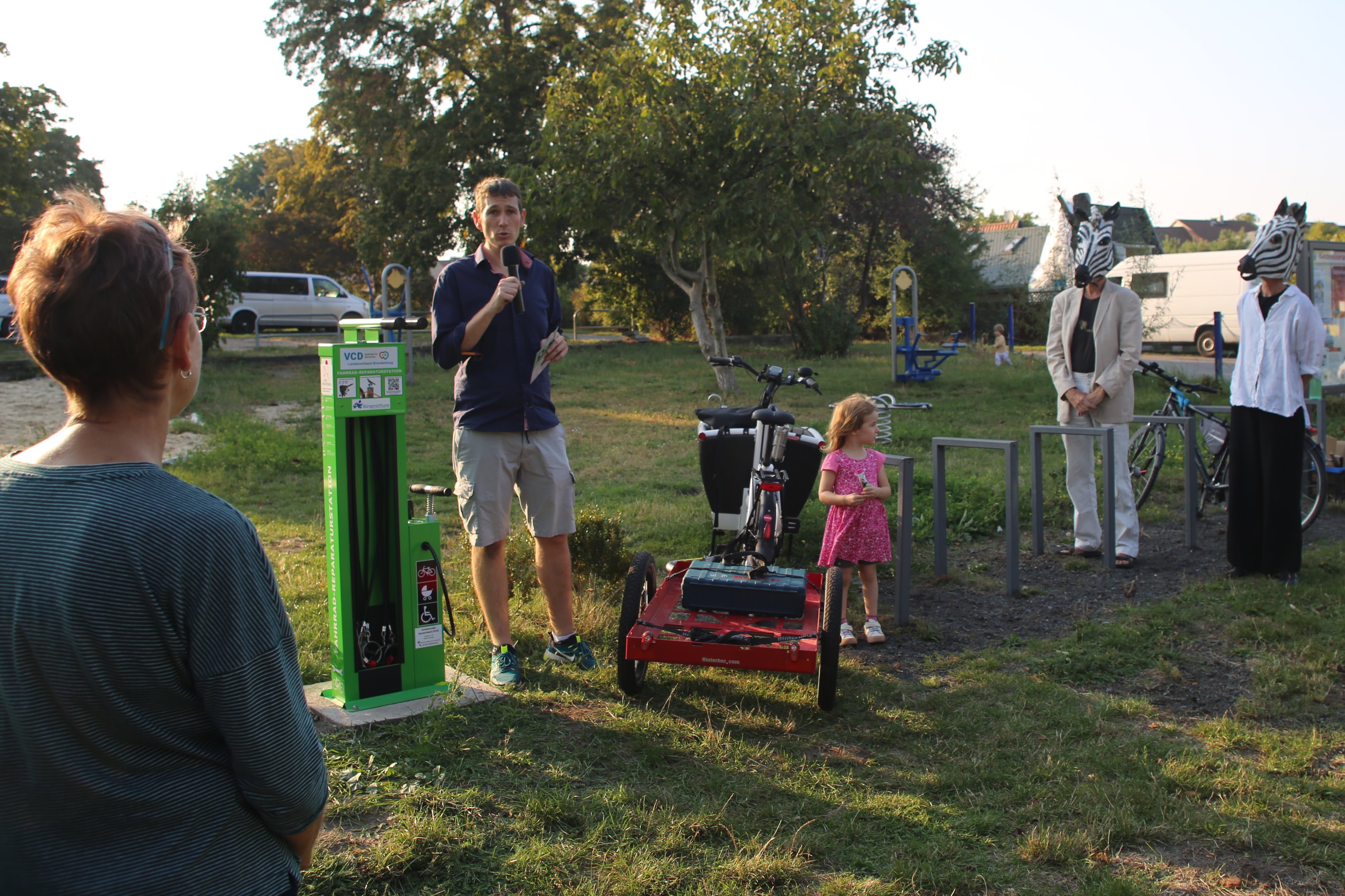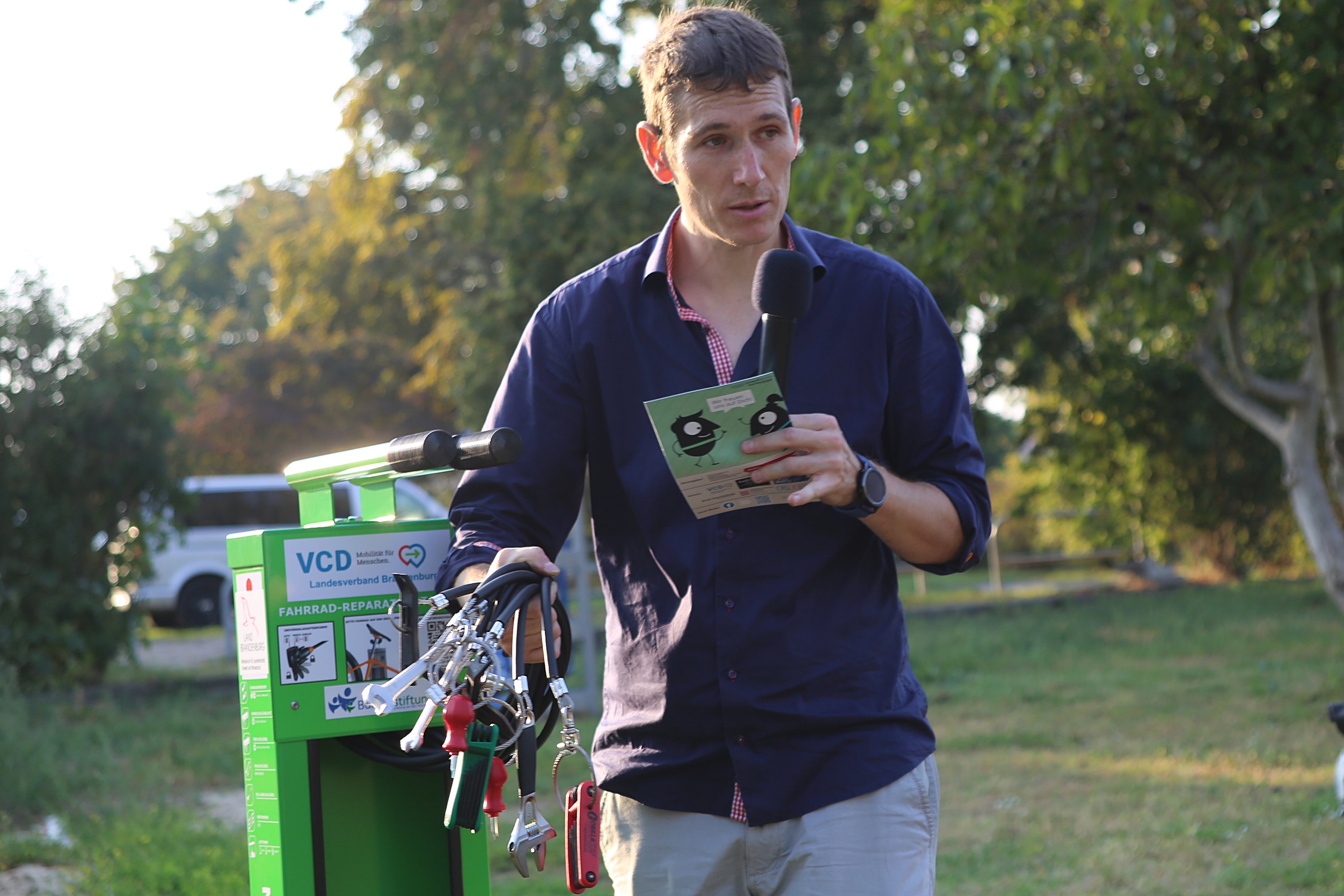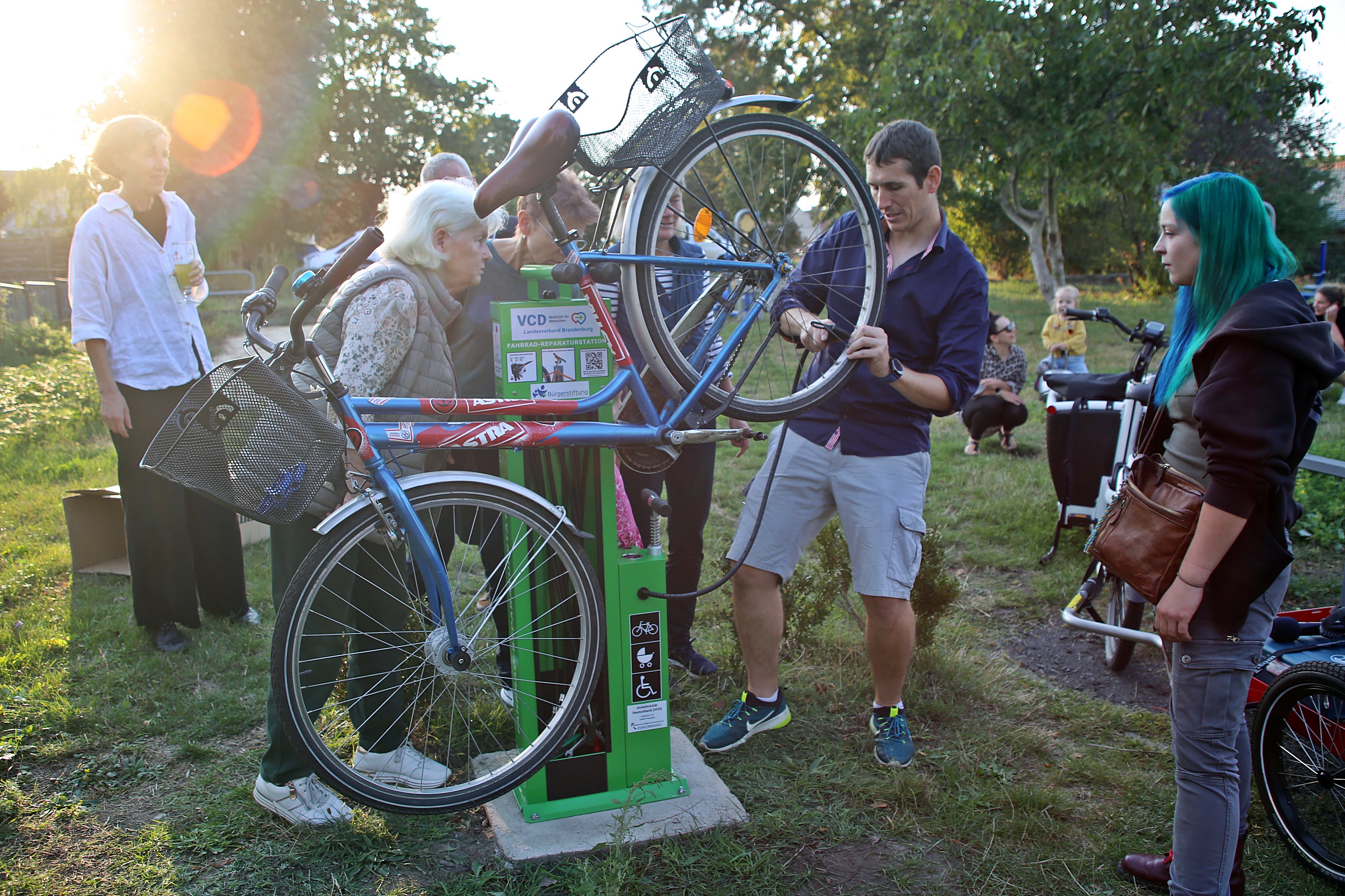VCD-Kreischef Frank Träger befragte die anwesenden Bürgerinnen und Bürgern wie sie mobil unterwegs sind und was sie sich für die Zukunft wünschen. Tenor: es gibt noch Nachholbedarf bei den Radwegen. Eine Mobilitätswende kann nur gelingen, wenn alle zusammenarbeiten: Politik, Vereine, Verbände und jeder einzelne Bürger. Danach reparierte Frank Träger Pedalen und Bremsen an einem Fahrrad, um zu zeigen wie einfach das sein kann. Für Reparaturen steht umfangreiches Werkzeug zur Verfügung und das Fahrrad kann dabei eingehängt werden.