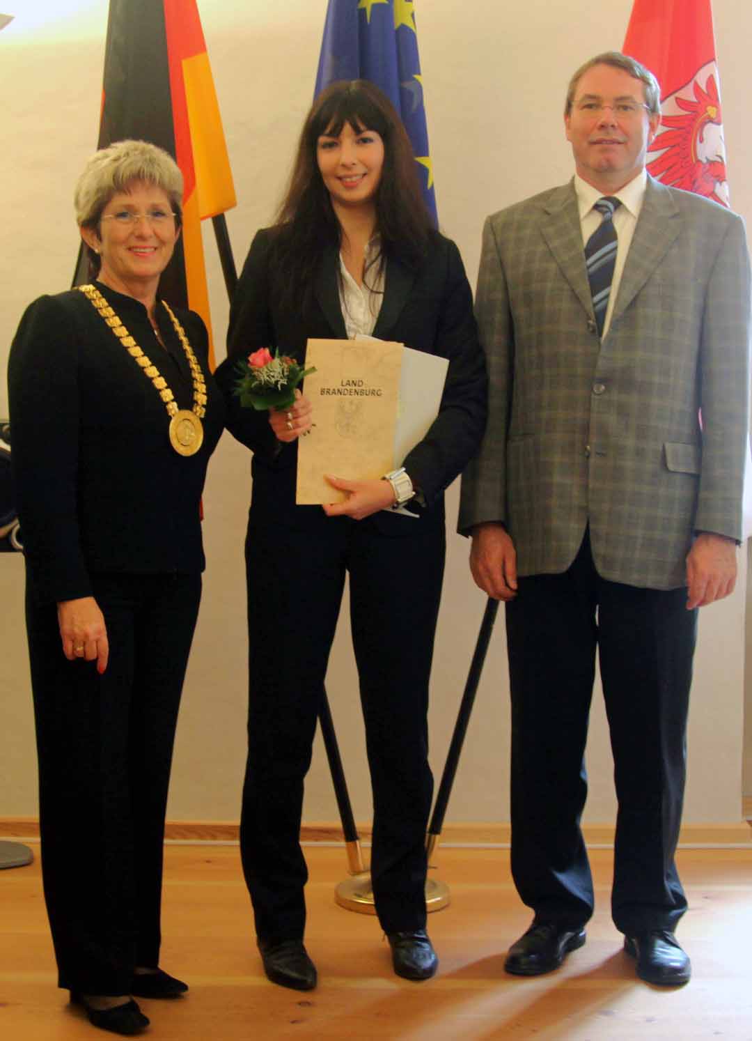 Oberbürgermeisterin Dr. Dietlind Tiemann nahm das feierliche Bekenntnis der Einbürgerungsbewerberin entgegen und überreichte ihr die Einbürgerungsurkunde, das Grundgesetz der Bundesrepublik Deutschland und die Landesverfassung des Landes Brandenburg.