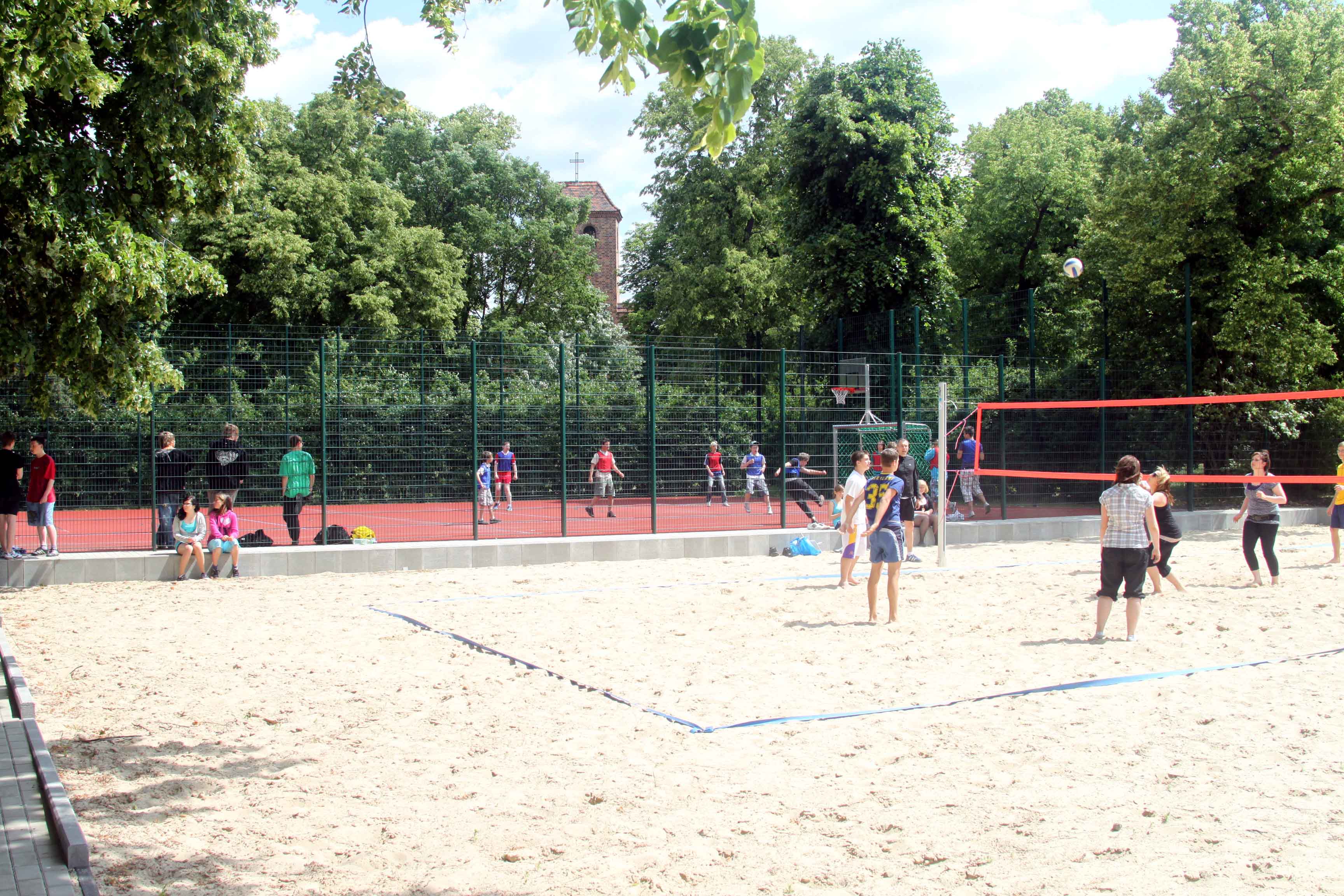 Die vorhandenen Anlaufbahnen, ehemals für Weitsprung genutzt, wurden Teil einer 130 m-Rundlaufbahn mit integrierter 75 m-Laufbahn. Angegliedert wurde ein Kleinspielfeld für Volleyball und eine Fläche mit 2 Tischtennisplatten. In der Rundlaufbahn befinden sich 2 Anlaufbahnen für eine in ein Beachvolleyballfeld integrierte Weitsprunggrube. Die Ausstattung des vorhandenen Kleinspielfeldes wurde ergänzt und der marode Kunststoffbelag saniert. Hier ist eine vielfältige Nutzung des Feldes für Basketball, Feldhockey, Volleyball und Badminton möglich. Weiterhin wurden Sitzmöbel aufgestellt, die als massiver Holzblock variabel genutzt werden können. Sie dienen unter anderem als Treffpunkt, Zuschauertribüne und Wartebereiche. Abseits der Spiel- und Bewegungsflächen wurde eine Ruhezone angelegt.