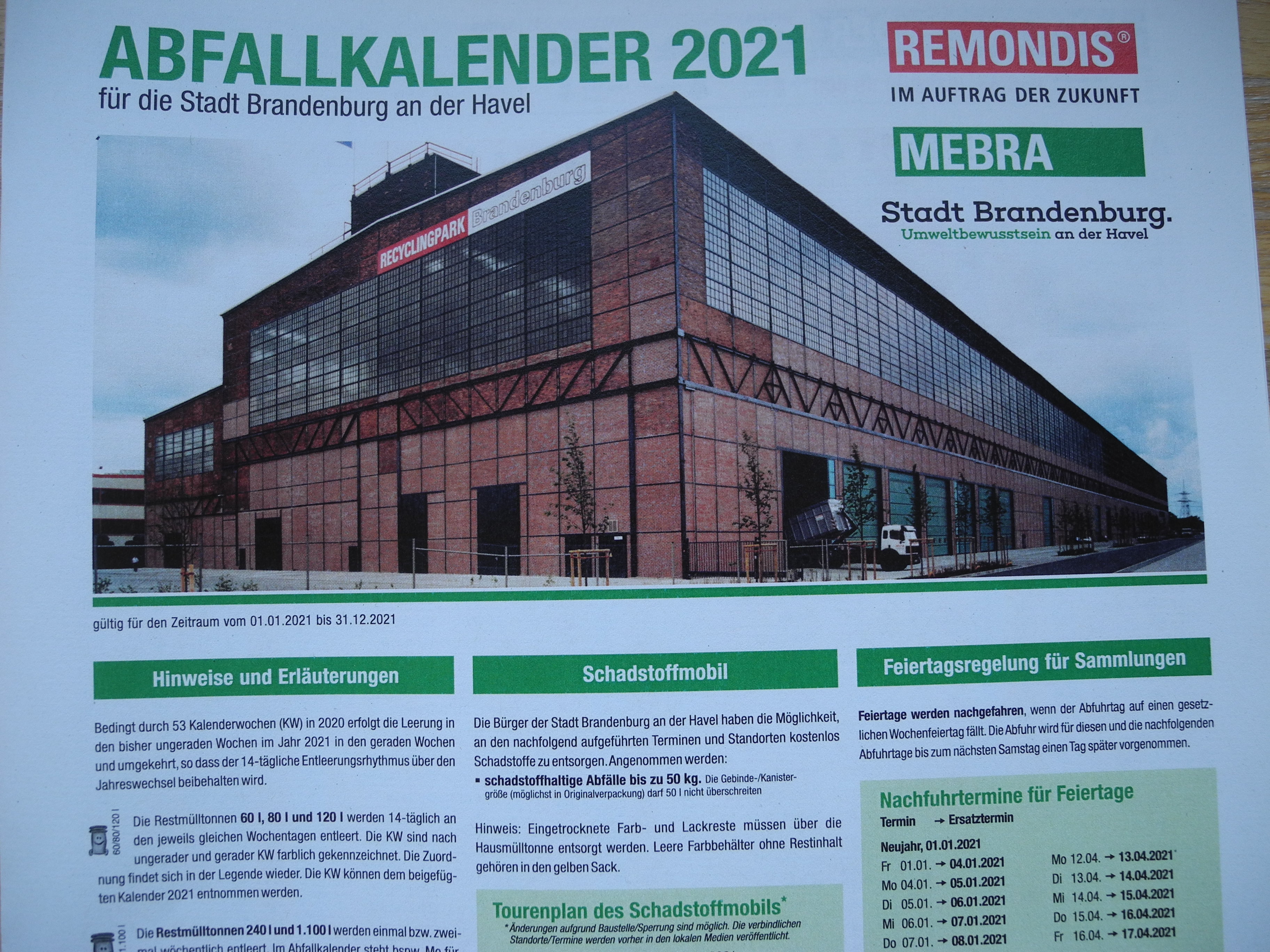 Die Bürger bzw. Grundstückseigentümer und Vermieter der Stadt Brandenburg an der Havel werden gebeten, ihre neuen Termine für 2021 für die Feiertagsentsorgung, Biotonnenreinigung, Weihnachtsbaumentsorgung sowie die Termine für die mobile Schadstoffsammlung zu überprüfen und vor allem die Änderungen zum Jahreswechsel zu berücksichtigen.