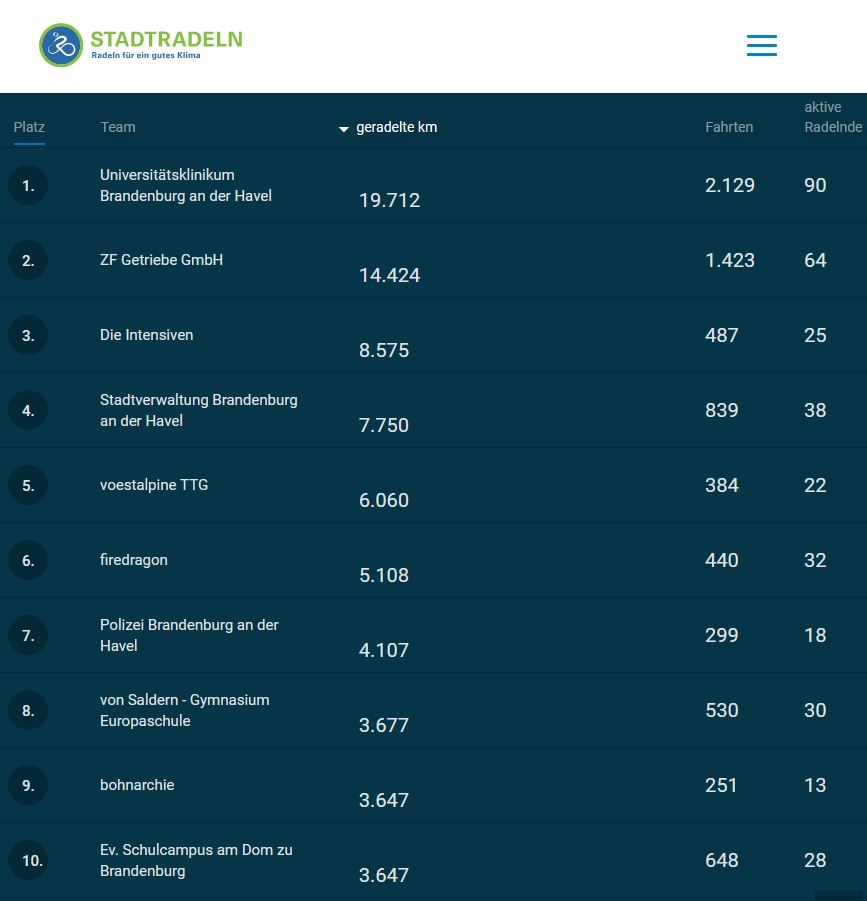Bereits das zweite Jahr in Folge gehen die meisten Kilometer auf die Radelkonten des „Universitätsklinikum Brandenburg an der Havel (Platz 1, 19.712 km*), gefolgt von dem Team der „ZF Getriebe GmbH„ (Platz 2,14.424 km*) und „die Intensiven“ (Platz 3, 8.575 km*). Einige Radfahrer legten in dem 3-wöchigen Aktionszeitraum über 1.000 km zurück, doch auch kürzere Kilometerstände trugen zum guten Gesamtergebnis und zur positiven CO2-Bilanz bei.