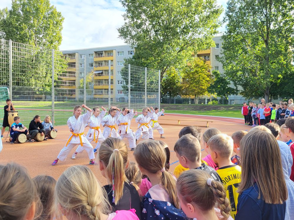 Für einen schwungvollen Auftakt sorgten die Trommel-AG und die Karate-AG der Schule. Im Anschluss probierten die Kinder die neuen Sportflächen mit viel Freude aus.