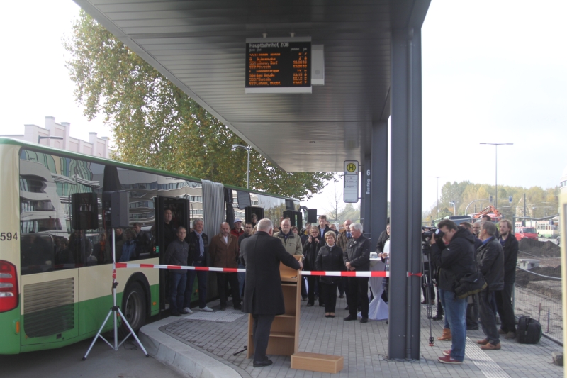 In ihrem Grußwort sagte Oberbürgermeisterin Dr. Dietlind Tiemann: „Eines der entscheidenden Teilprojekte, die im Ergebnis des städtebaulichen Wettbewerbs von den Planern und Architekten zu Papier gebracht und in den vergangenen Monaten sukzessive realisiert wurden, ist dieser neue ZOB.“ Weiter sagte sie: „Gemeinsam müssen wir alles daran setzen, dass die Zeit der Provisorien für die Bahnkunden, die Nutzer des ÖPNV sowie die Rad- und Autofahrer bald vorbei ist und auch die Fahrbahneinengungen auf der Bundesstraße endlich ein Ende haben.“