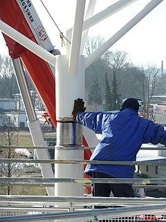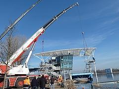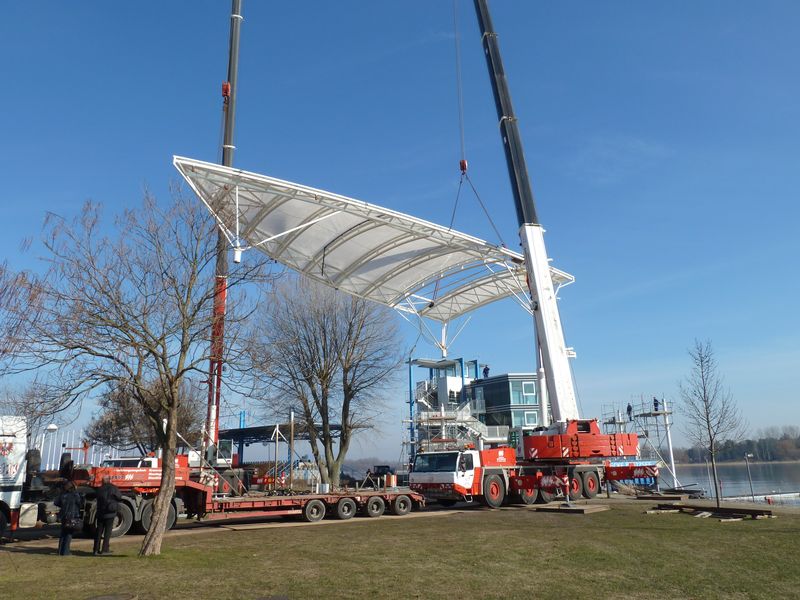Mit zwei großen Kränen, die über eine Tragkraft von 220 bzw. 110 Tonnen verfügen, wurde am Freitag, 25.02.2011, auf dem Gelände der Regattastrecke Beetzsee die interessante Dachkonstruktion über den Neubauteil des Zielrichterturmes gehoben und an den vorhandenen acht Meter hohen Stützen befestigt. Gemeinsam mit Brandenburgs Bürgermeister Steffen Scheller und dem Leiter des städtischen Eigenbetriebes Gebäude- und Liegenschaftsmanagement verfolgten Vertreter des Potsdamer Sportministeriums sowie Repräsentanten von Wassersportverbänden und -vereinen und die am Projekt beteiligten Planer, Architekten und Bauleute sowie zahlreiche Journalisten, wie die segelförmige Konstruktion in die Luft gehievt und punktgenau an der vorgesehenen Stelle abgesetzt wurde.