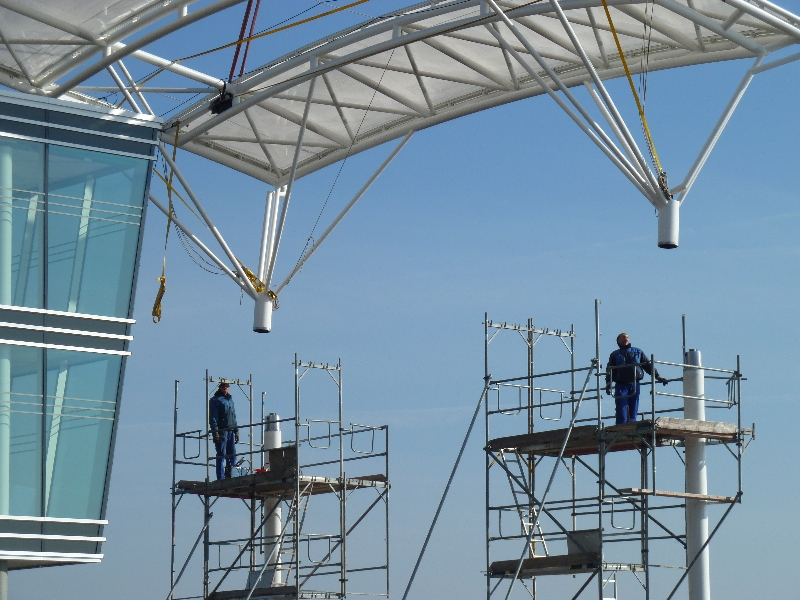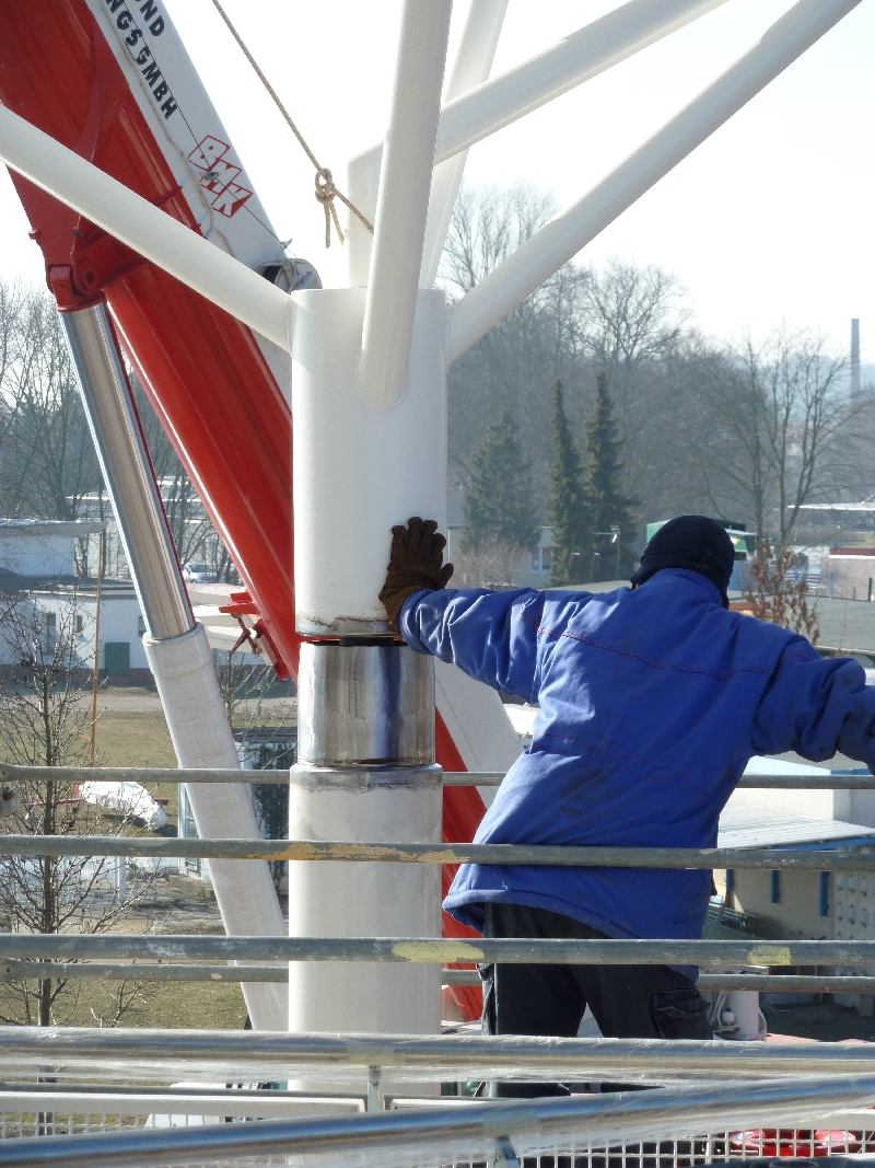 - Verarbeitung von 22 t Stahl aus Rundrohr verschiedener Dimensionen bis Dm. 323mm x 20mm (Stützen); 168mm x 12,5mm (Primärträger), die aneinandergelegt eine Länge von ca. 450 m ergeben