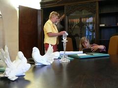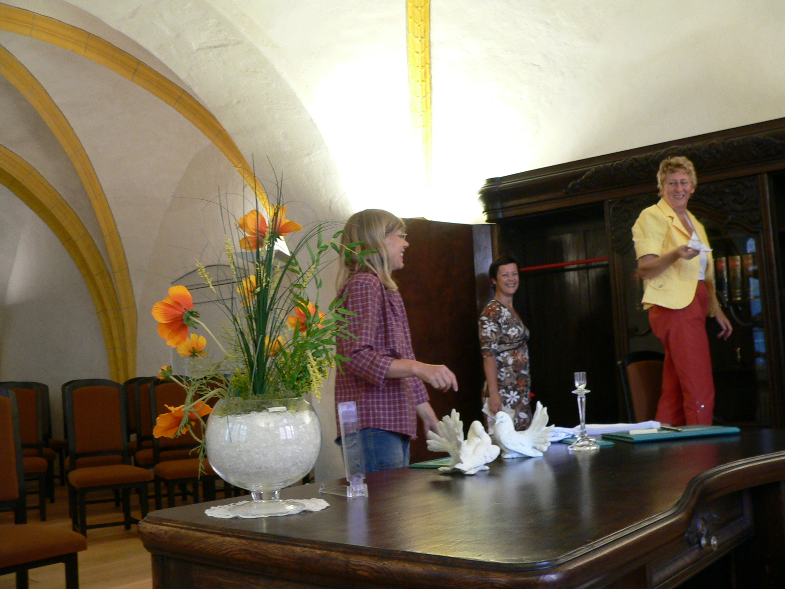 Letzte Handgriffe haben in den vergangenen Tagen die Mitarbeiterinnen des Standesamtes angelegt, um das neue Trauzimmer im Altstädtischen Rathaus für die ersten Eheschließungen herzurichten. Die ersten beiden Trauungen finden am Sonnabend, 14.06.2008, statt. Laut Auskunft der Standesbeamtinnen gibt es bereits über 20 Anfragen für weitere Eheschließungen im Altstädtischen Rathaus.