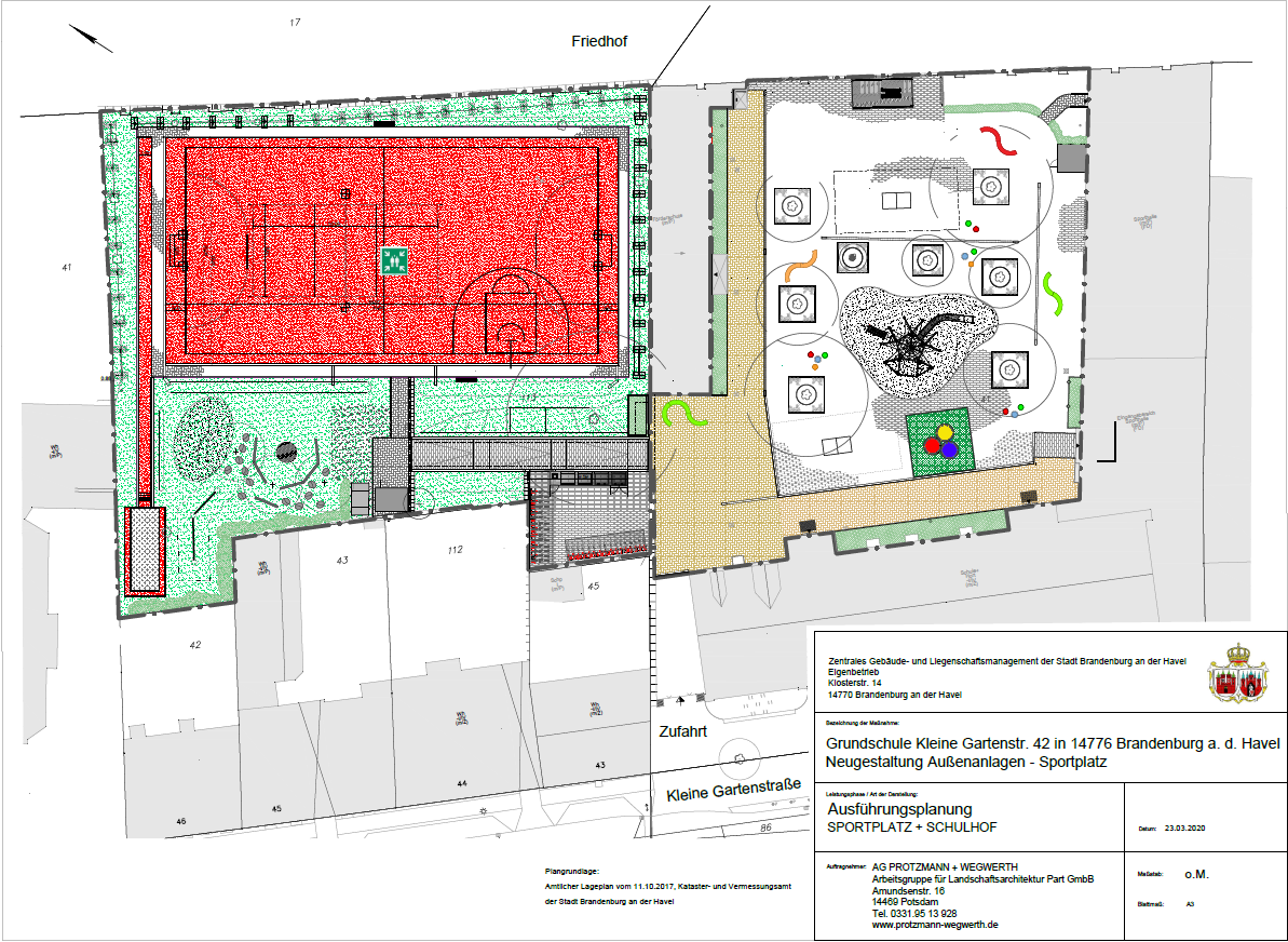 Ab voraussichtlich 17.04.2020 beginnen die Bauarbeiten im Bereich des Sportplatzes der Grundschule Kleine Gartenstraße, die bis Juli 2020 (Ausnahme Pflanzarbeiten) beendet sein sollen. Im Anschluss (geplant ab 15.07.2020) beginnen die Baumaßnahmen auf dem Schulhof, die im Oktober 2020 abgeschlossen werden.