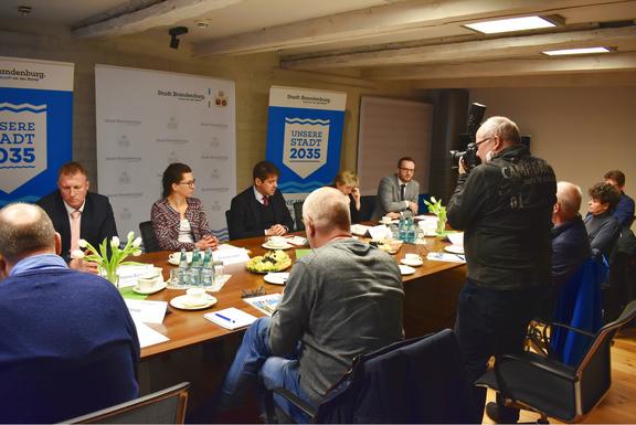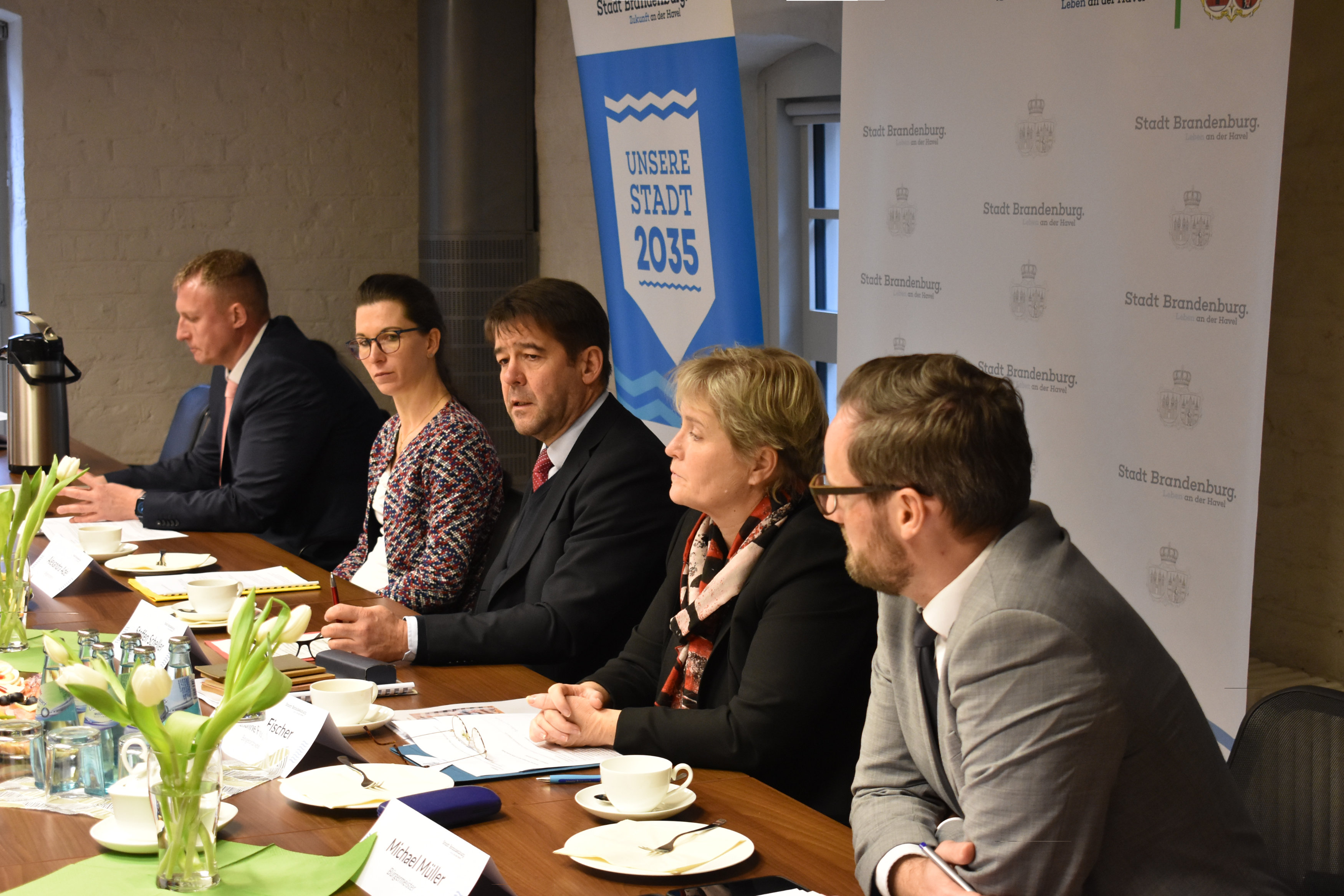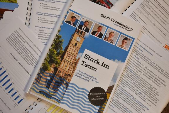 OB Steffen Scheller und die Beigeordneten der Stadt Brandenburg an der Havel stellten am Montag, 23. Januar 2023, in einem Pressegespräch den Fahrplan der Stadt für das Jahr 2023 vor: