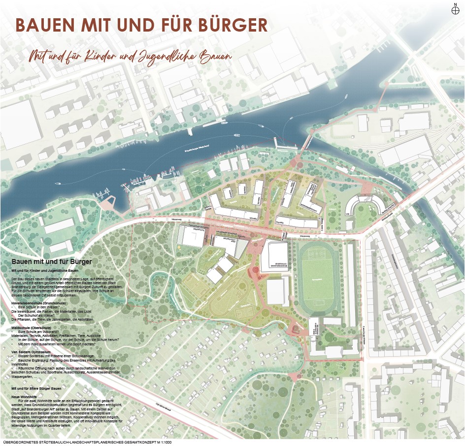 Allen drei Arbeiten ist dabei gemeinsam, dass sie ein urban-verdichtetes Quartier vorschlagen, welches Stadt weiterdenkt und die Verbindung von nördlichem Havelufer in den angrenzenden Landschaftsraum baulich ausformuliert.
