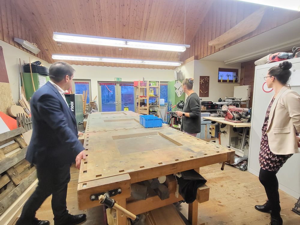 Gespräch in der Holzwerkstatt.