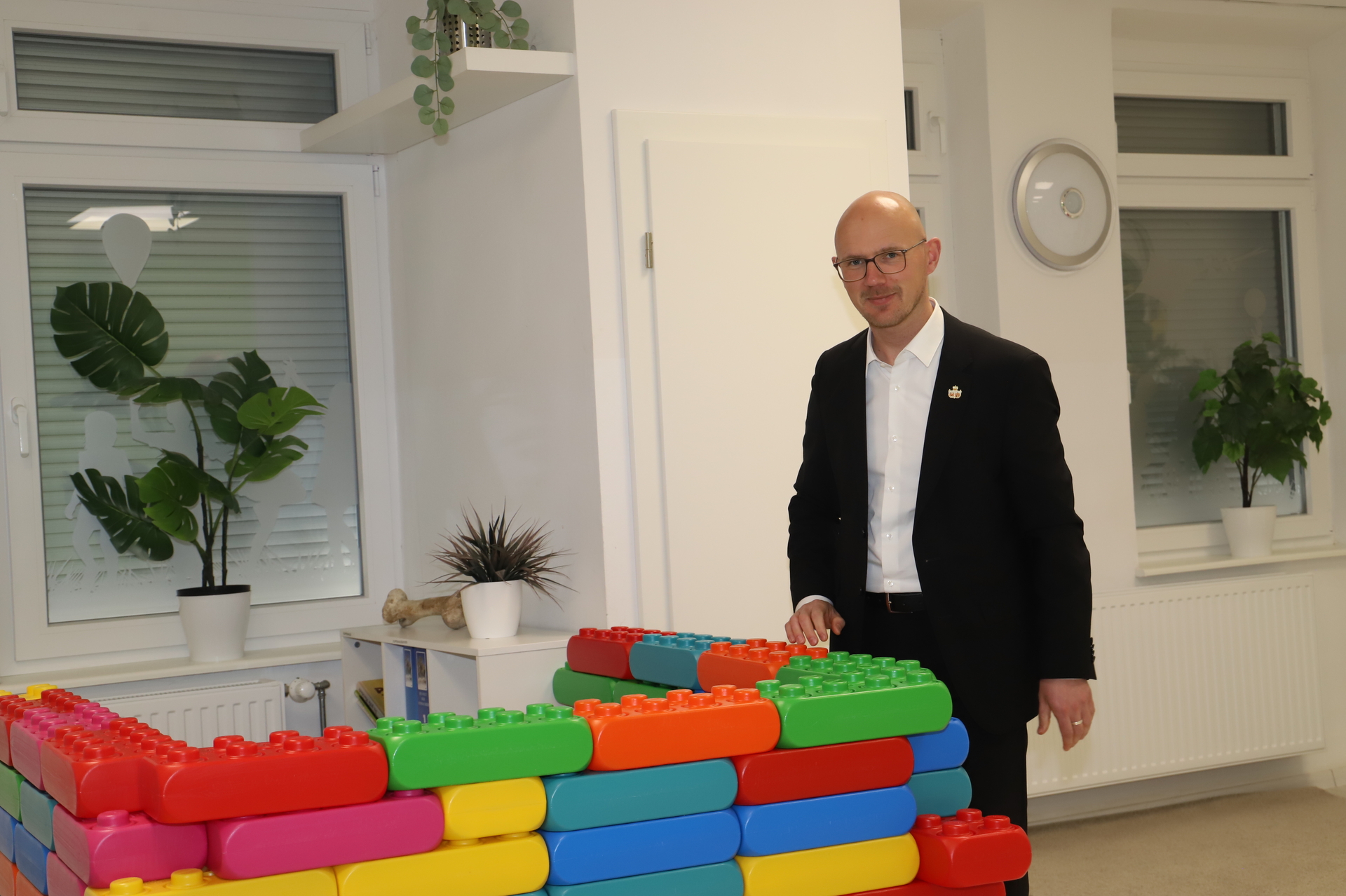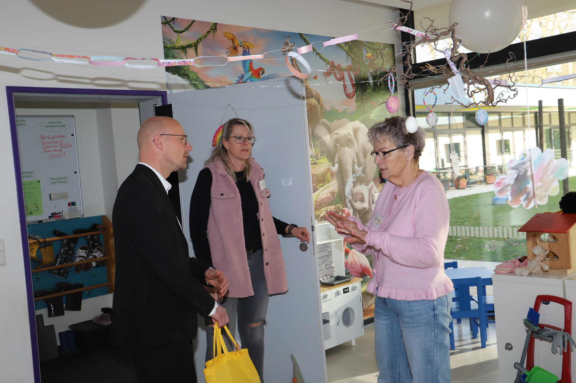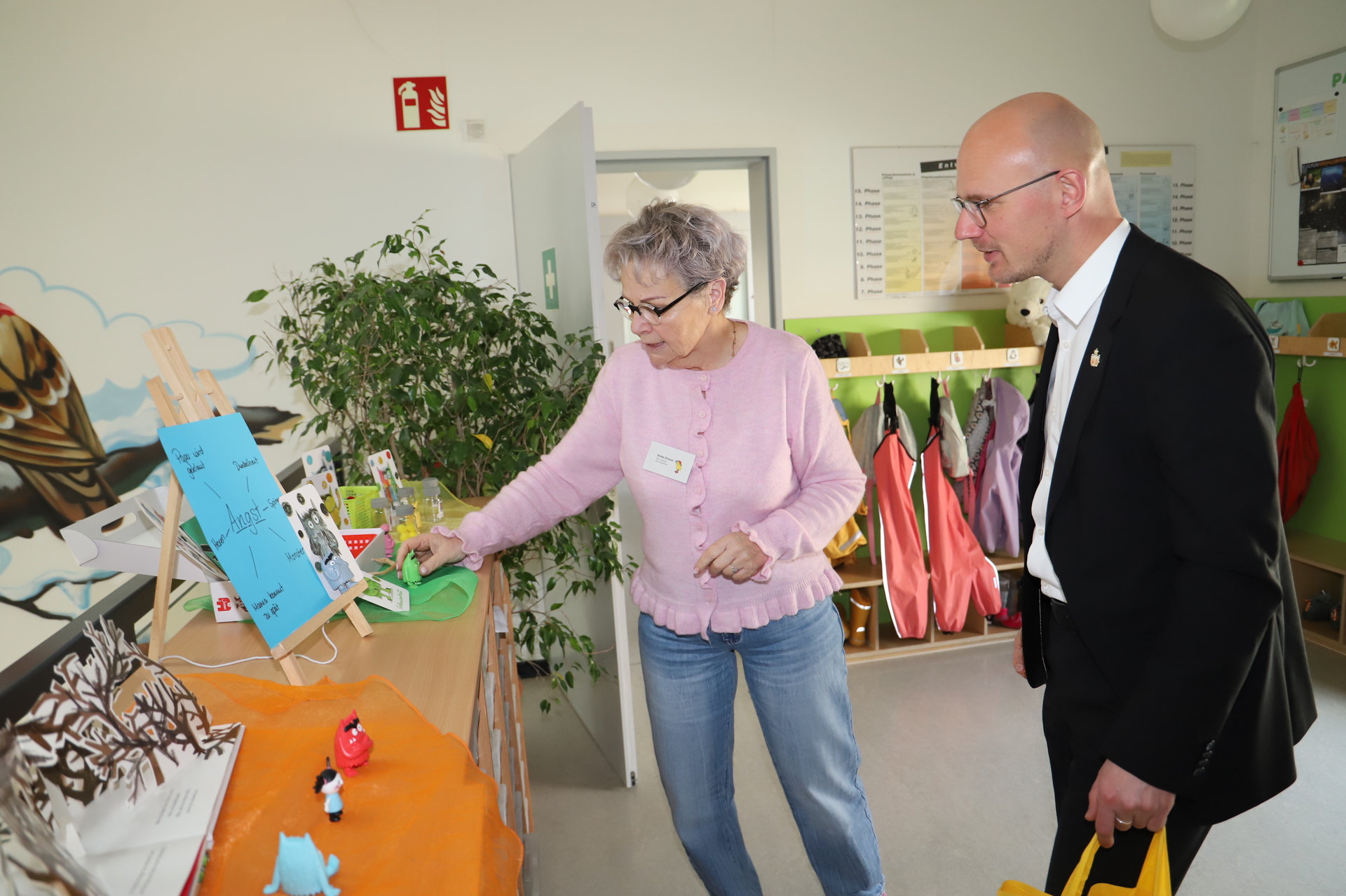 Daniel Keip erhielt Einblicke in den Alltag der Kinder. Er beobachtete eine Yogastunde, probierte sich beim Bauen mit großen Legosteinen und besuchte den hauseigenen Hasenbereich. Die Angebote orientieren sich am Bedarf der Kinder. Dazu gehören unter anderem eine Relaxhöhle, ein Puppenspielbereich, ein Hausaufgabenraum für Hortkinder und eine Bastelwerkstatt. Dort entstehen derzeit Ostergeschenke.