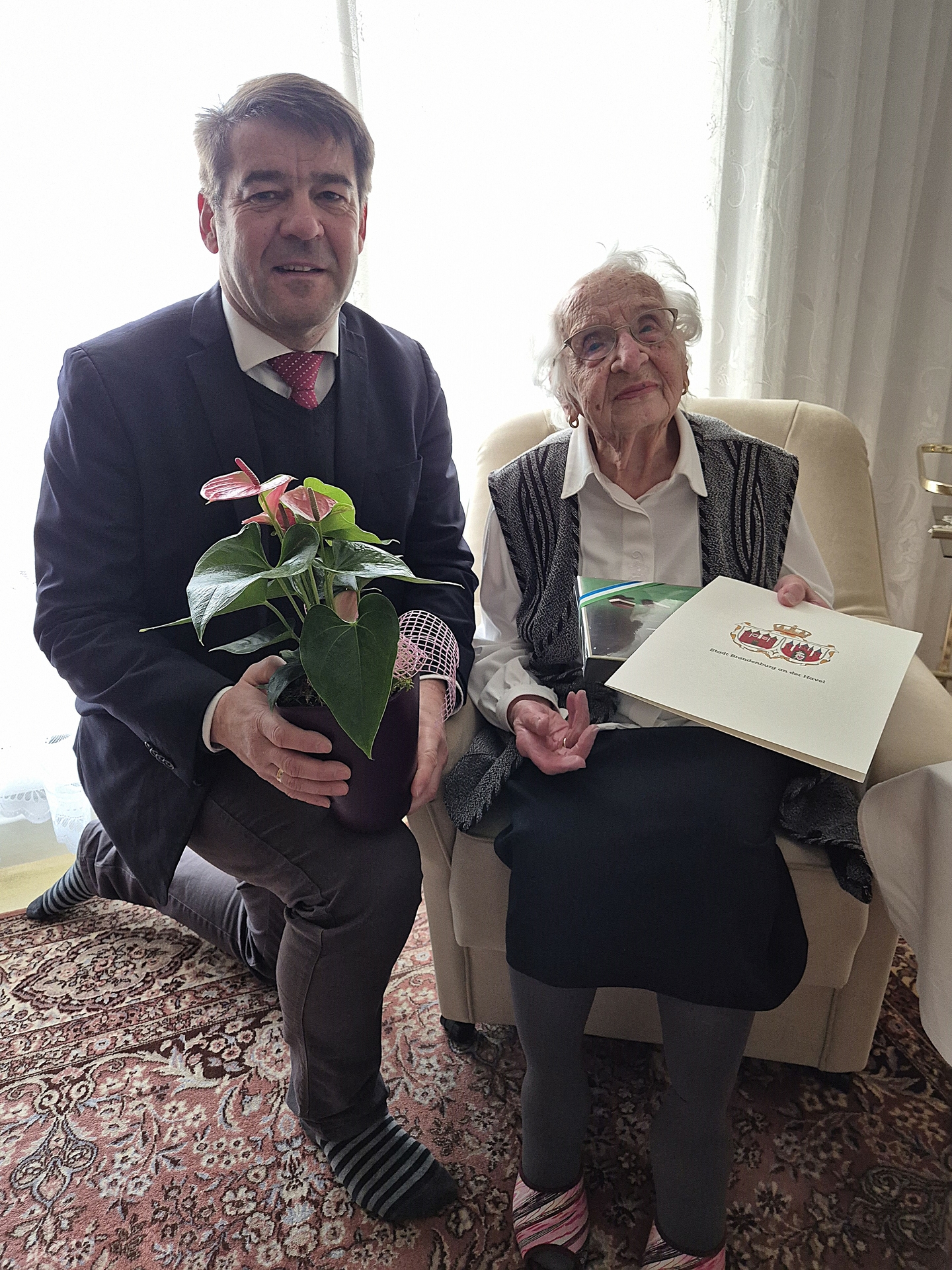 Zur ihrem 101. Geburtstag konnte Gertrud Knittel erneut den Oberbürgermeister der Stadt Brandenburg an der Havel als Gast begrüßen. Steffen Scheller: