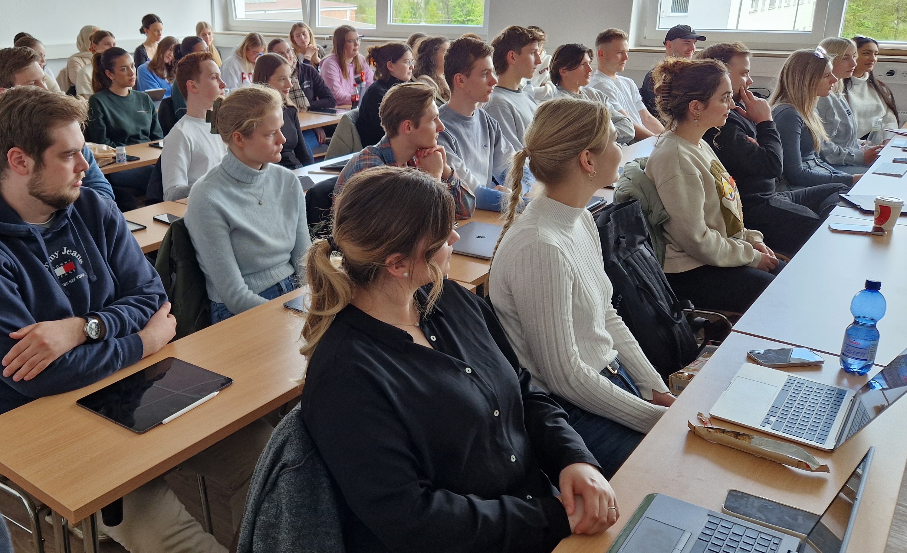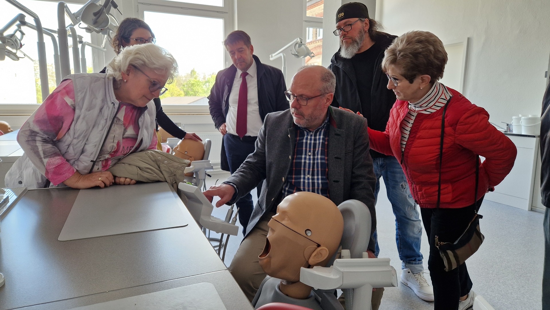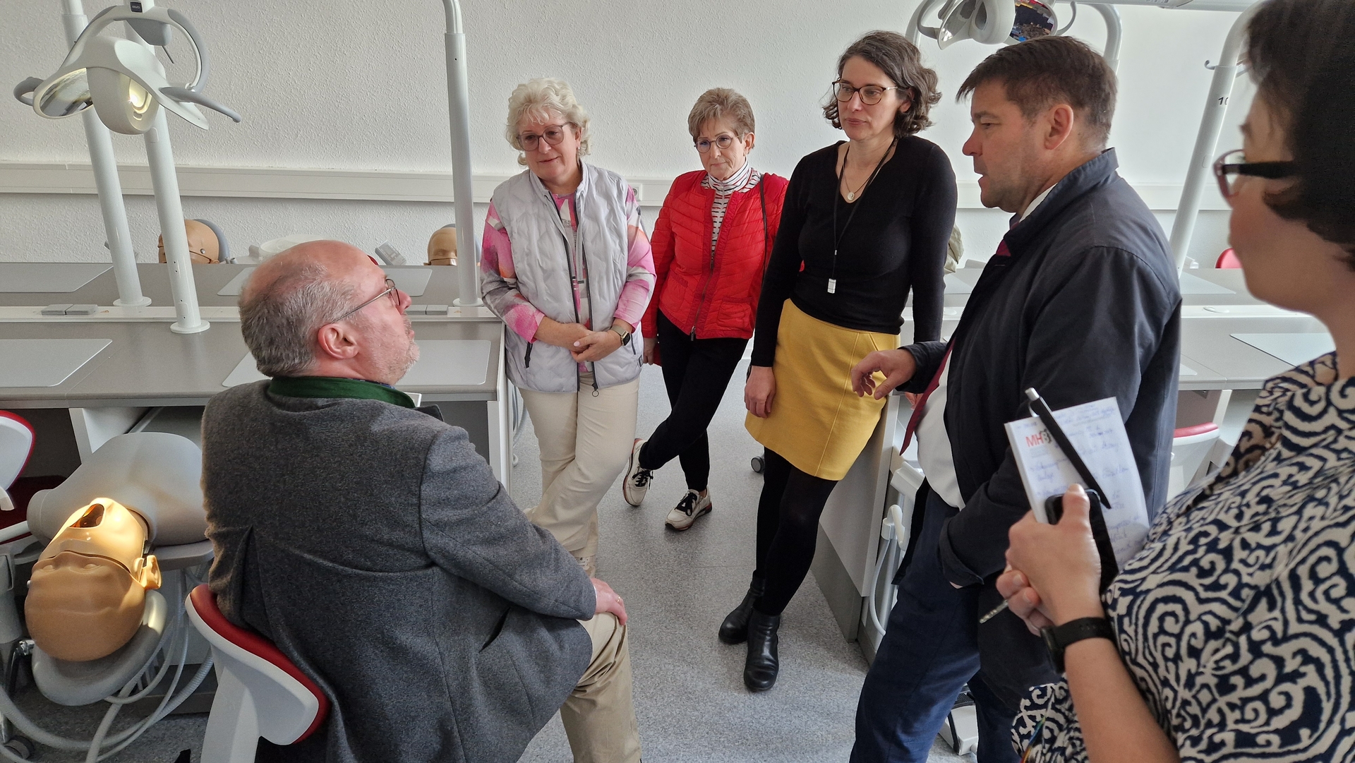 Die ersten Zahnmedizin-Studierenden der Medizinischen Hochschule Brandenburg waren am 6. April 2024 im Paulikloster feierlich immatrikuliert worden und bekamen in ihrer dritten Studienwoche Besuch von Oberbürgermeister Steffen Scheller. Er wollte die 48 Studierenden kennenlernen, von ihren ersten Brandenburg- und Studien-Erlebnissen erfahren und sich das Lehrgebäude in der Geschwister-Scholl-Straße ansehen. Wo einst die Dekra-Akademie zuhause war, stehen Brandenburgs ersten Zahnmedizin-Studenten in ihrem Übergangsquartier die zweite und dritte Etage zur Verfügung.