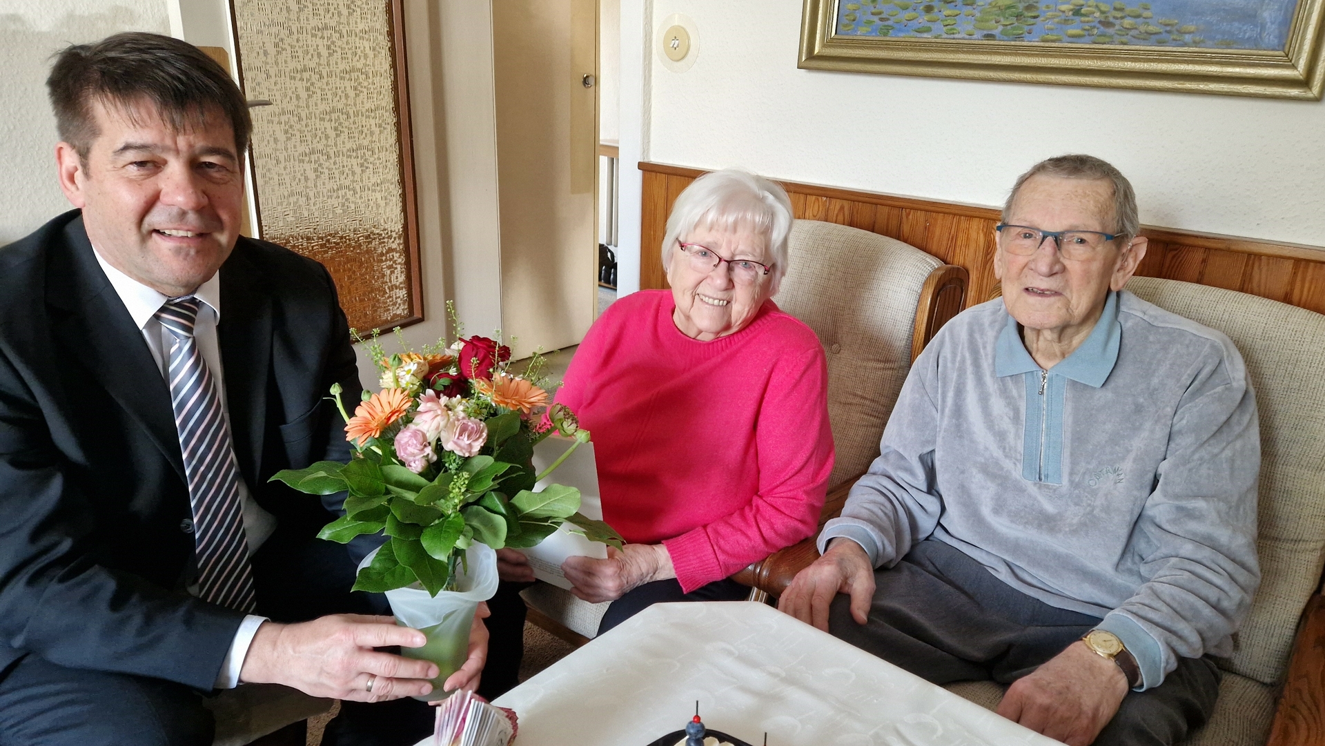 Als Gast an ihrem 70. Hochzeitstag konnten Annelies und Erwin Kolakowski am 27. März 2024 Oberbürgermeister Steffen Scheller begrüßen. Zu besonderen Jubiläen überbringt das Stadtoberhaupt gern persönlich Glückwunsche und Blumen und diesmal auch die Glückwunsch-Urkunden der Stadt, des Bundespräsidenten sowie des Ministerpräsidenten. Und er nimmt sich Zeit für ein Plauderstündchen. So erzählten die rüstigen Senioren aus ihrem Leben, dass sich wegen eines auszuleihenden Westernromanes kreuzte.