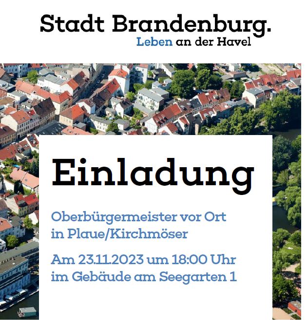 Zur Fortsetzung der Veranstaltungsreihe „Oberbürgermeister vor Ort“ lädt Oberbürgermeister Steffen Scheller am Donnerstag, dem 23. November 2023 um 18:00 Uhr, alle Bewohnerinnen und Bewohner der Stadtteile Plaue und Kirchmöser in das Gebäude Am Seegarten 1 ein.