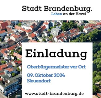 Zur Fortsetzung der Veranstaltungsreihe „Oberbürgermeister vor Ort“ lädt Oberbürgermeister Steffen Scheller am Mittwoch, dem 9. Oktober 2024 um 18:00 Uhr, alle Bewohnerinnen und Bewohner des Stadtteils Neuendorf in das Gemeindehaus der Kirche, Am Anger, in Neuendorf ein.
