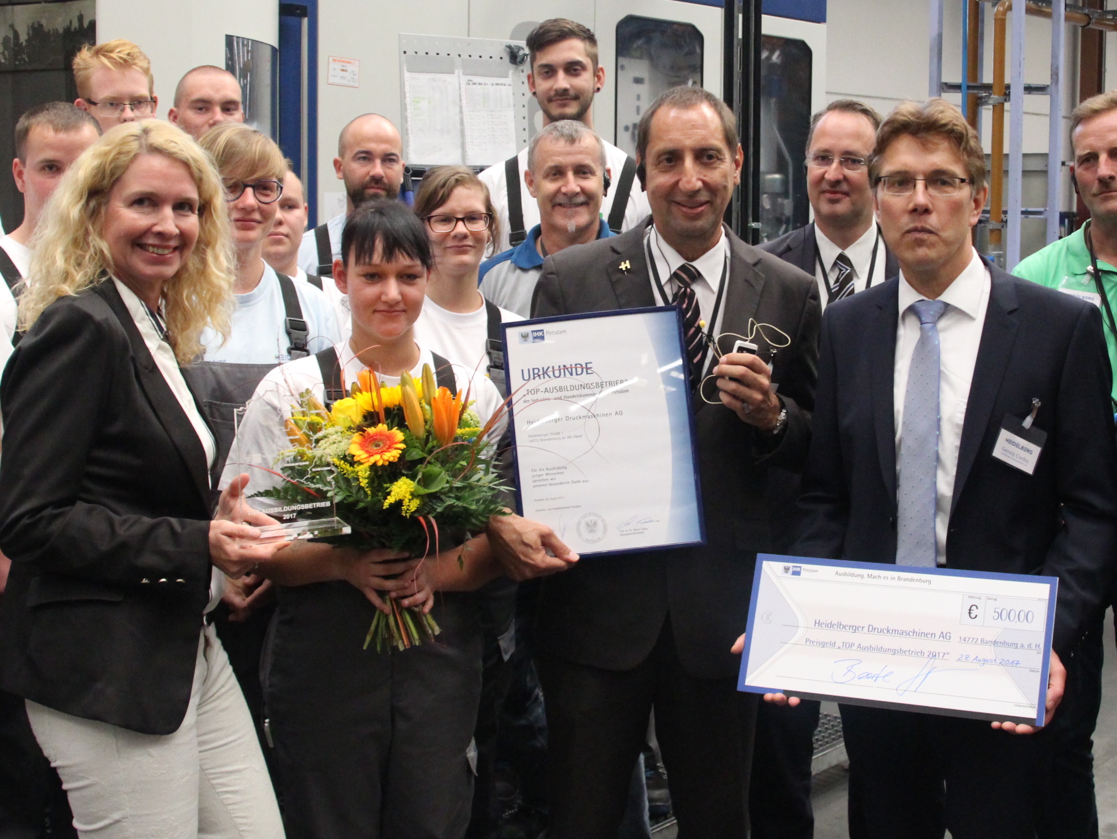 Am Montag, 28.08.2017, wurde die Heidelberger Druckmaschinen AG in Brandenburg an der Havel im Beisein von Bildungsminister Günter Baaske und Oberbürgermeisterin Dr. Dietlind Tiemann als „TOP-Ausbildungsbetrieb“ ausgezeichnet. Die Präsidentin der IHK Potsdam, Beate Fernengel überreichte die Auszeichnung an den Geschäftsführer Gerwin Cordes.