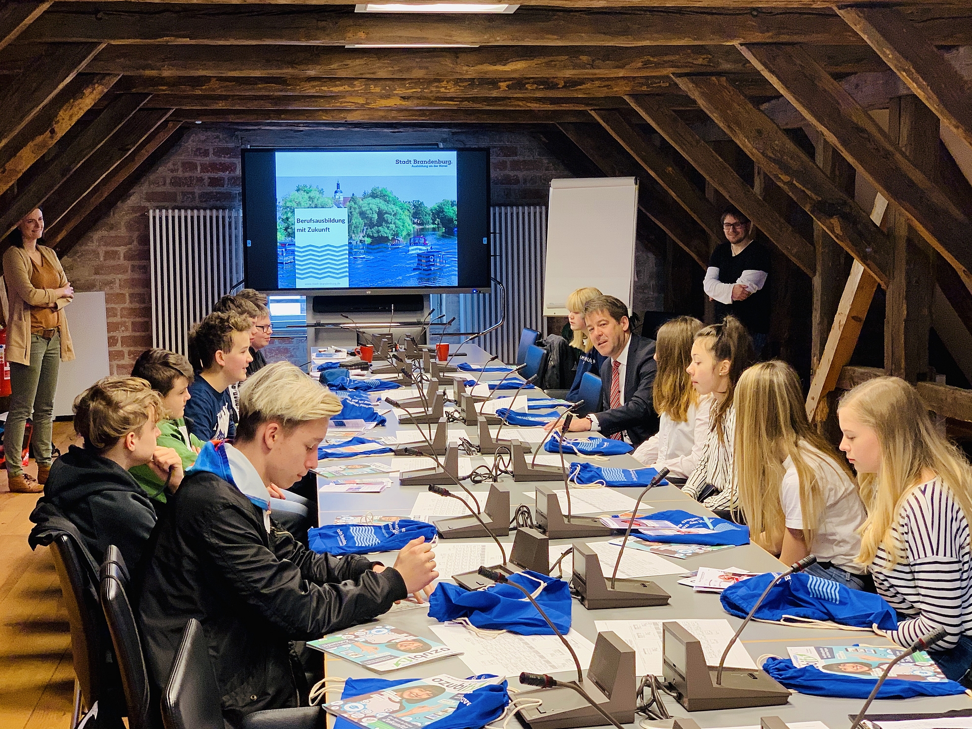 Am Mittwoch, dem 11. März 2020, lud Oberbürgermeister Steffen Scheller im Rahmen der jährlichen Unternehmenserkundungen interessierte Schülerinnen und Schüler der 8. Klasse aus der Oberschule Brandenburg Nord zu einem Besuch bei der Stadtverwaltung Brandenburg an der Havel ein.
