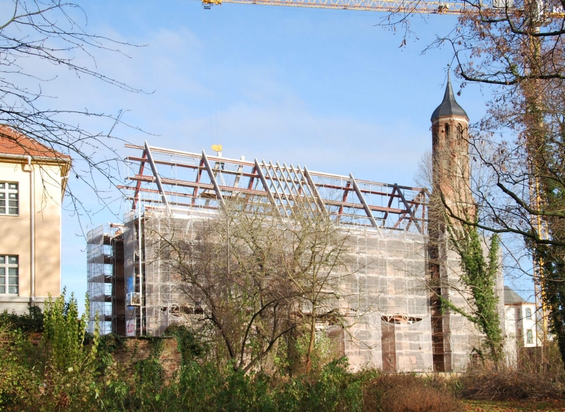 „Jetzt wird der Baufortschritt an der St. Johanniskirche jeden Tag deutlicher und es zeigt sich, wie wichtig die Entscheidung zur Wiederherstellung der historischen Dachform war.“ freut sich der Beigeordnete Michael Brandt.