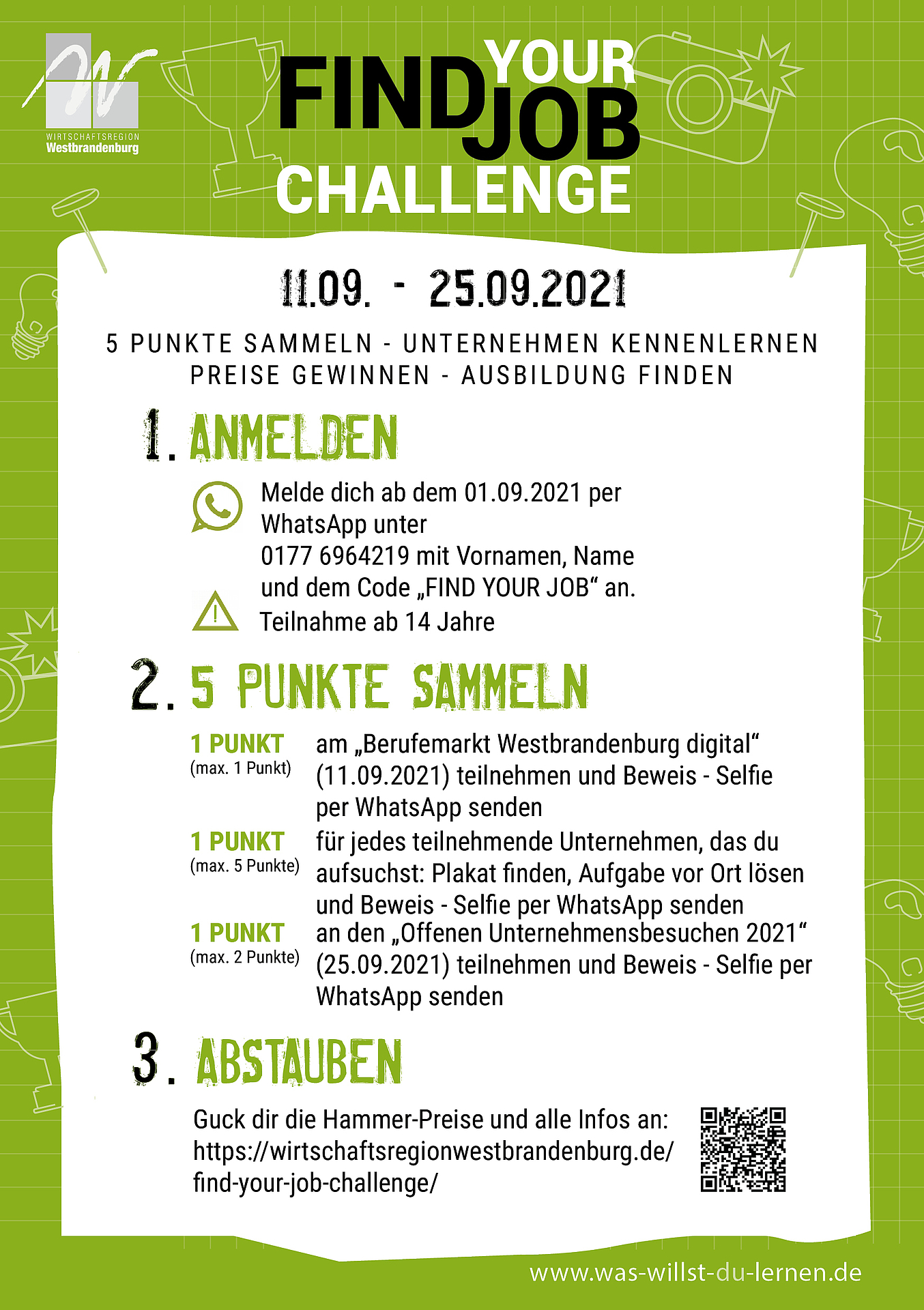 Erstmals in diesem Jahr führen wir in Kooperation mit der Kreissportjugend Havelland die „FIND YOUR JOB-Challenge“ durch. Jugendliche werden damit aufgefordert, sich aktiv mit ihrer beruflichen Zukunft und den teilnehmenden Unternehmen der „Offenen Unternehmensbesuche 2021“ auseinanderzusetzen. Unter den Teilnehmenden werden unter anderem ein (E)Scooter im Wert von 300 €, ein Skater-Set nach Wahl, Gutscheine und viele weitere coole Preise verlost. Dafür müssen die Jugendlichen fünf Aufgaben absolvieren. Punkte können die Teilnehmenden bei der Lösung von Challenge-Aufgaben der Unternehmen sowie der Teilnahme an den „Offenen Unternehmensbesuchen 2021“ ergattern. Neugierig geworden?