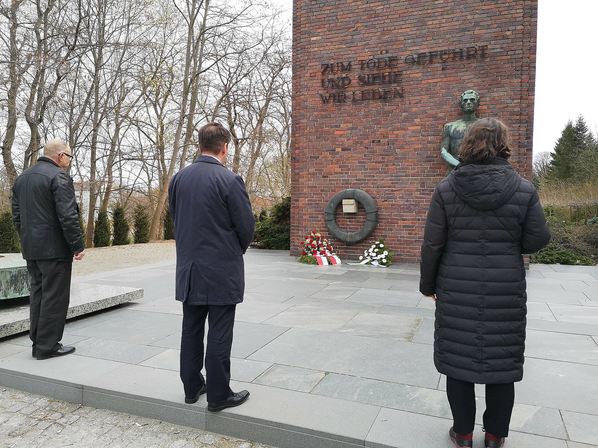 Alljährlich werden Ende April am sowjetischen Ehrenmal in der Steinstraße, an der Gedenkstätte auf dem Marienberg sowie am Gedenkort in der JVA Kränze niedergelegt, um an die Befreiung des Zuchthauses Brandenburg-Görden und das Ende des Zweiten Weltkrieges zu erinnern. Corona-bedingt kann auch in diesem Jahr keine öffentliche Gedenkveranstaltung, gemeinsam mit den Brandenburgerinnen und Brandenburgern, duchgeführt werden, so dass bereits am 15.04.2021 eine Kranzniederlegung mit Oberbürgermeister Steffen Scheller gemeinsam mit Innenminister Michael Stübgen und Gedenkstättenleiterin Dr. Silvia de Pasquale stattgefunden hat und aufgezeichnet wurde.