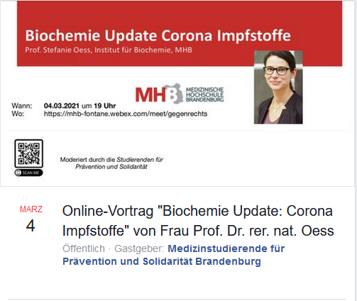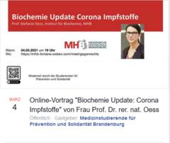 Deshalb laden wir Euch am Donnerstag, dem 04.03.2021 um 19:00 Uhr, zum Online-Vortrag „Biochemie Update: Corona Impfstoffe“ von Frau Prof. Dr. rer. nat. Oess (Institut für Biochemie an der Medizinischen Hochschule Brandenburg) hiermit herzlich ein.