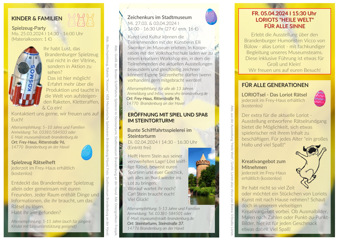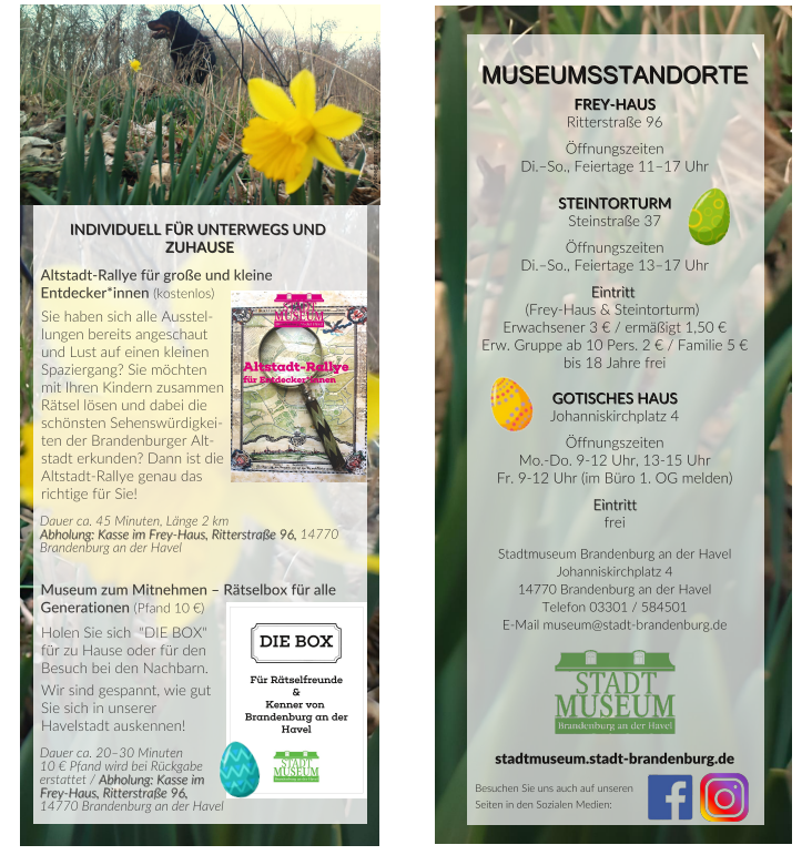 Details zu Terminen, Inhalten und Anmeldungen finden Sie und findet Ihr auf der Website des Stadtmuseums unter stadtmuseum.stadt-brandenburg.de/kinder-schulklassen und stadtmuseum.stadt-brandenburg.de/erwachsene-familien