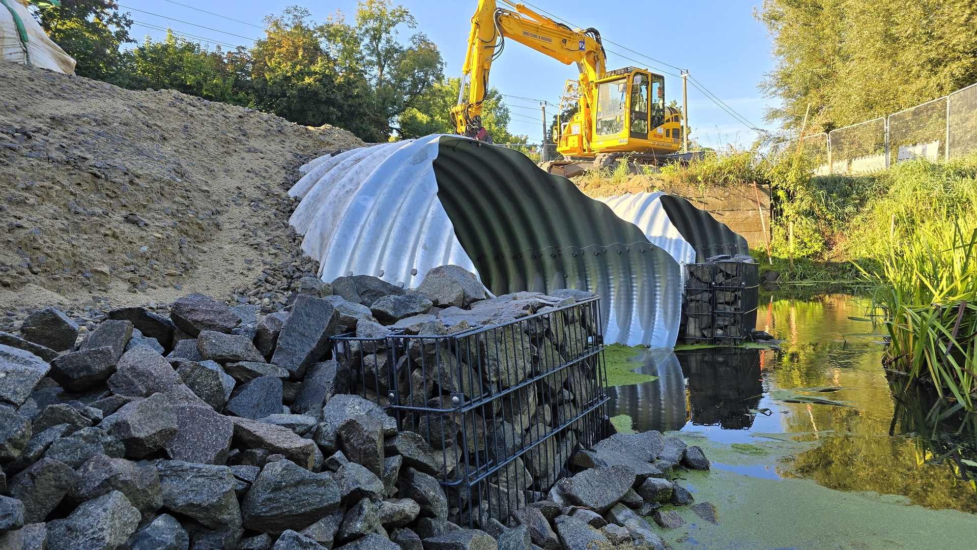 Seit Demontage des maroden Brückenüberbaus in der letzten Juliwoche ist auf der Baustelle viel geschehen. Im ausgebaggerten Flussbett sind auf entsprechendem Unterbau die beiden jeweils 15 Meter langen Durchlass-Fertigteile aus feuerverzinktem Wellblechstahl positioniert und seitlich verfüllt worden, sodass das Planewasser ungehindert weiterfließen kann. Erste Gabionen und Steinwände stützen den aufgeschütteten Wall samt Überbau seitlich ab, auf dem bald der Straßenaufbau erfolgen kann, um am 16. September planmäßig mit den Asphaltarbeiten beginnen zu können. Gegenwärtig werden die Straßenanschlüsse vorbereitet, in dem die alte Asphaltdecke aufgebrochen wird, unter der unerwartet die ursprüngliche Pflasterstraße zum Vorschein kam.