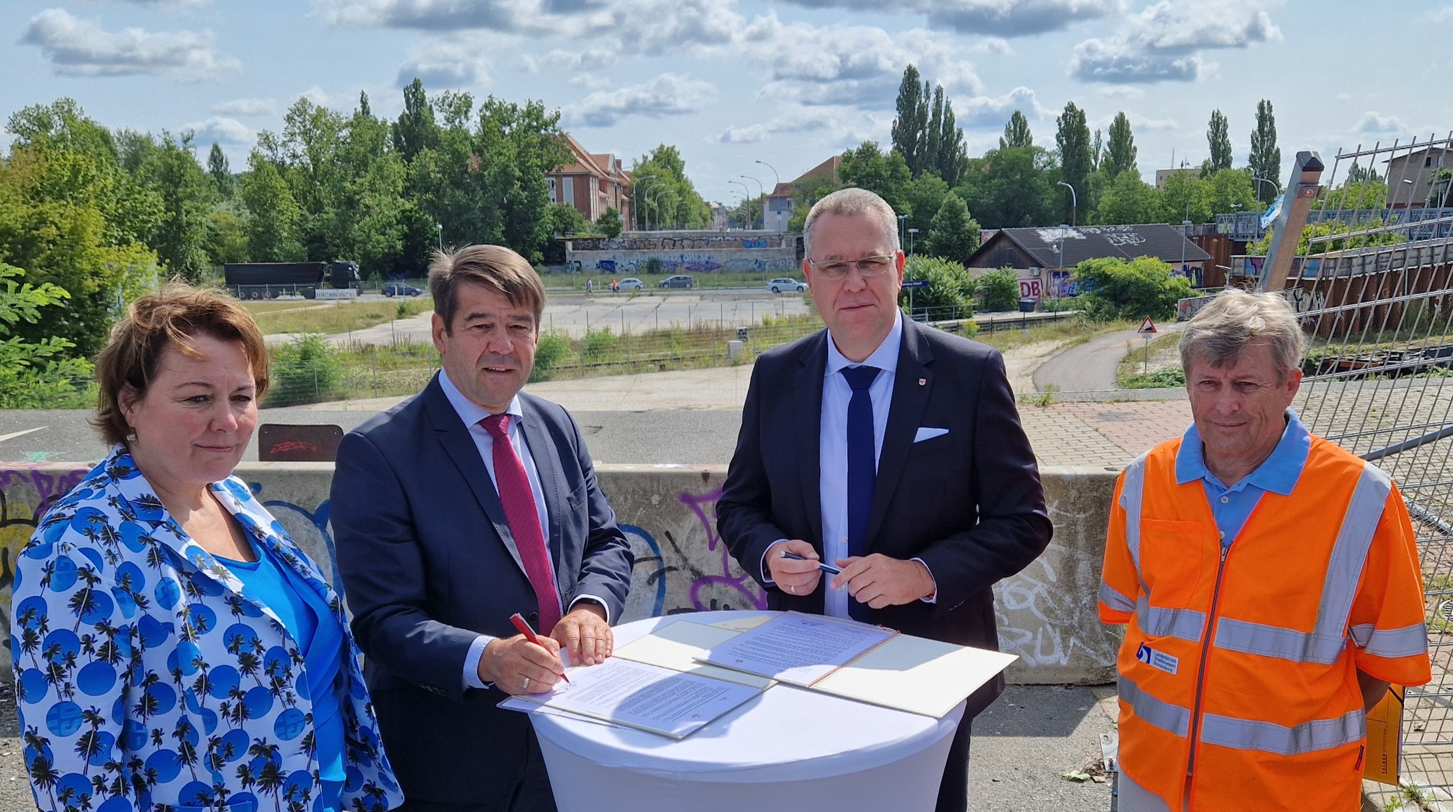Verkehrsminister Rainer Genilke hat sich heute bei Oberbürgermeister Steffen Scheller und beim Landesbetrieb Straßenwesen über die Planung für den Wiederaufbau der Brücke am Altstädtischen Bahnhof informiert.