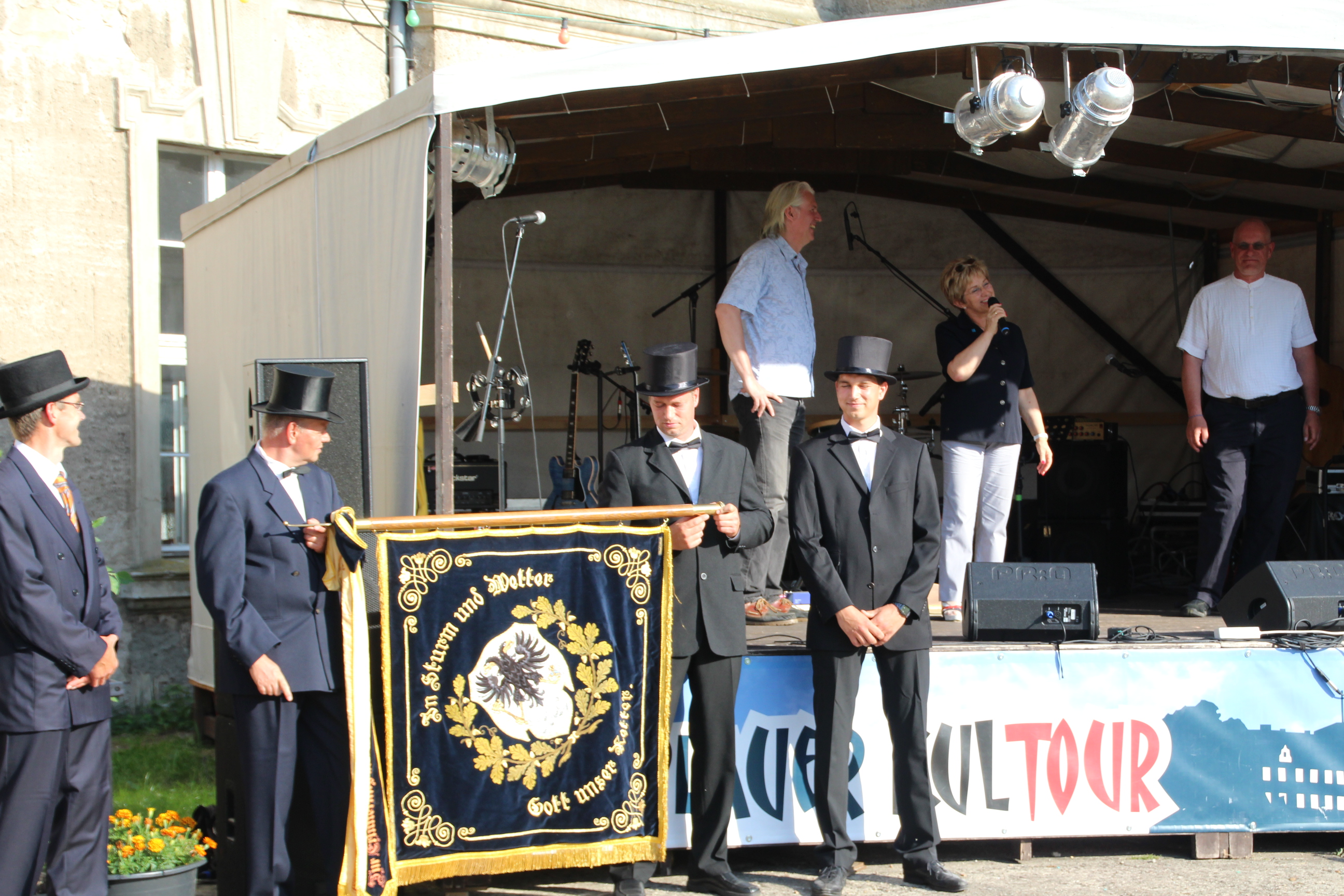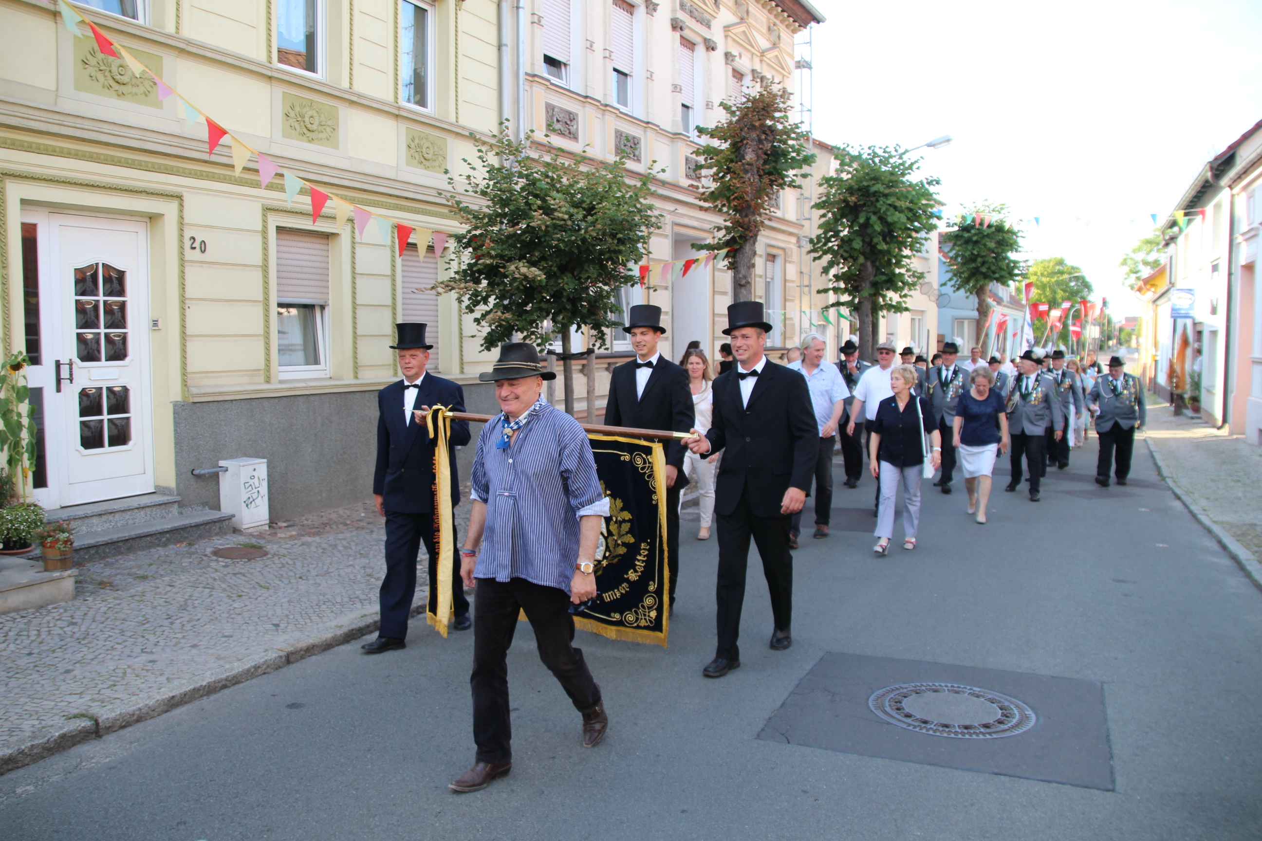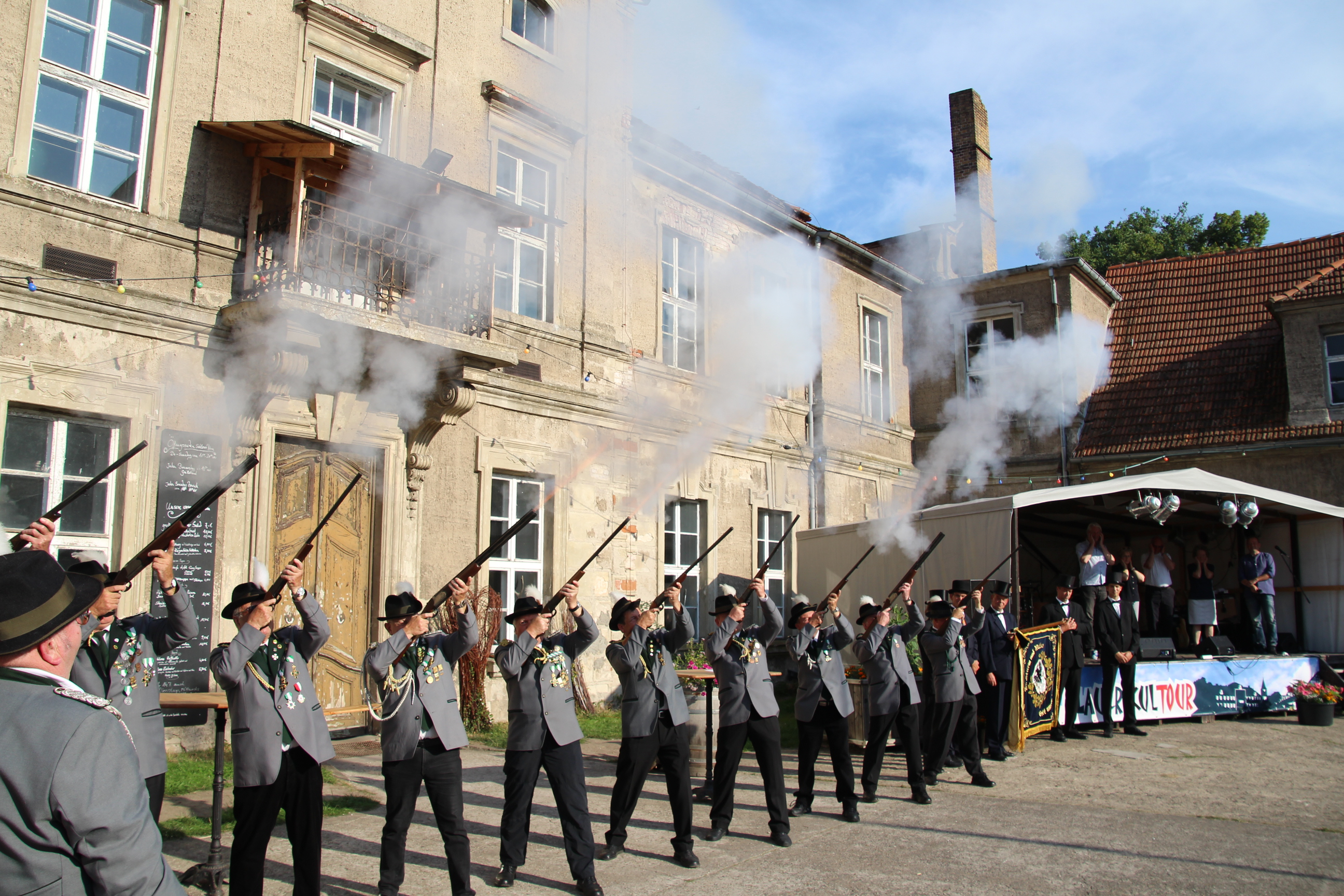 Zum Auftakt des 19. Fischerjakobi in Plaue marschierten am Freitag, 24.07.2015, Oberbürgermeisterin Dr. Dietlind Tiemann, Schlossherr Andreas Keuchel, Pfarrer Christian Bochwitz und Ortsvorsteherin Dr. Lieselotte Martius sowie weitere Festgäste gemeinsam mit den Fischern zum Festgelände. Dort wurde mit drei Salven der „Plauer Schützengilde 1875 e.V. das dreitägige Spektakel offiziell eröffnet.