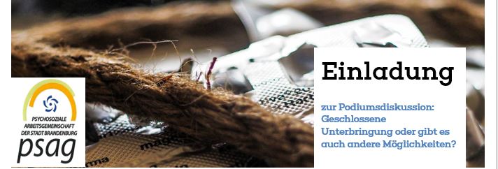 Im Rahmen dieser Ausstellung lädt die Psychosoziale Arbeitsgemeinschaft der Stadt Brandenburg an der Havel (PSAG) alle interessierten Brandenburgerinnen und Brandenburger zu einer Podiumsdiskussion unter dem Titel „Geschlossene Unterbringung oder gibt es auch andere Möglichkeiten?“ am Donnerstag, dem 23. Juni 2022 um 17:00 Uhr in die Johanniskirche ein.